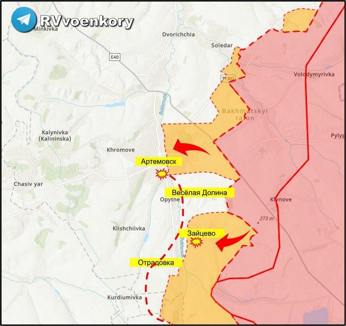 Армия России вела наступление в районах н.п. Соледар, Бахмутское, Яковлевка, Отрадовка, Зайцево, Артемовск, Красногоровка, Победа, Водяное и Любомировка.