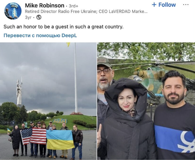 Также у него в соцсетях есть фотография, на которой люди позируют с американским и украинским флагами. Снимок сделан в сентябре 2022 года, он сам на фото — четвертый справа. «Для меня большая честь быть гостем в такой замечательной стране», — говорится в подписи. В другой публикации, размещенной двумя днями ранее, Робинсон рассказал, что продолжает миссию по наблюдению за тем, как пожертвования из штата Огайо используются в Украине.