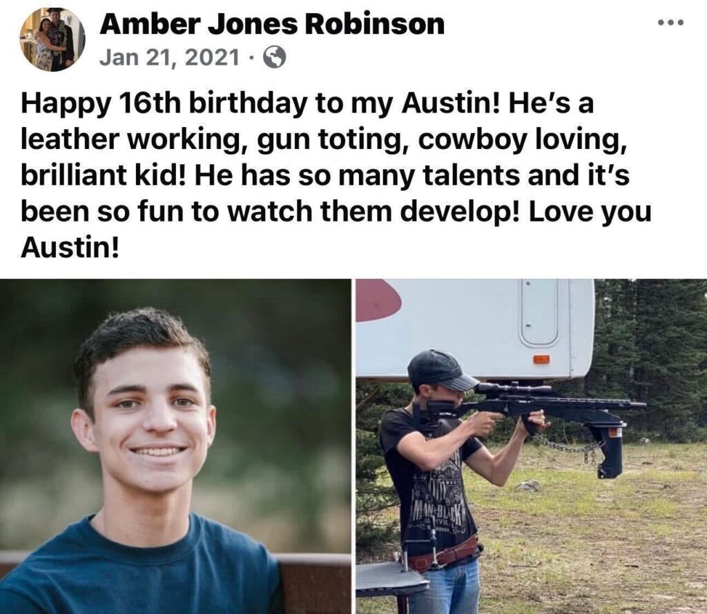 Но сначала журналистка нашла старые фотографии подозреваемого Тайлера Робинсона на страницах соцсети его матери Эмбер Джонс Робинсон. На снимках обвиняемый изображен в более младшем возрасте и с оружием в руках.