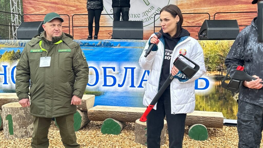 Губернатор Минской области Алексей Кушнаренко и пресс-секретарь Президента Наталья Эйсмонт получили в дар топоры от главного судьи чемпионата Сергея Ульдиновича.