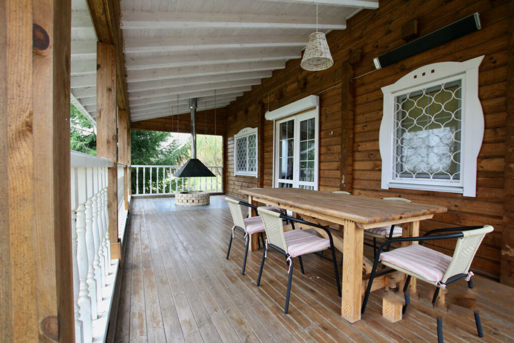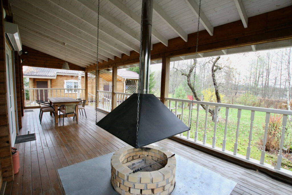 С тыльной стороны дома к нему примыкает большая терраса, которая находится под общей крышей. На этой террасе установлен оригинальный уличный камин-жаровня. С этой летней гостиной открывается живописный вид на озерные просторы.