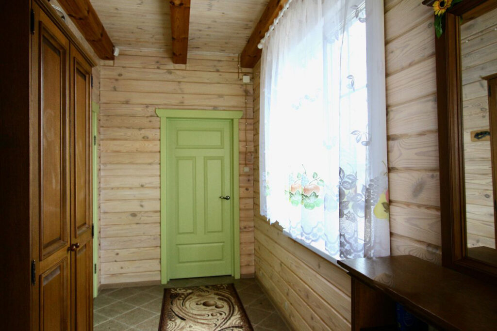 Строение, выполненное из профилированного бруса, было построено в 2015 году. Крыша дома двухскатная, пологая и покрыта металлочерепицей. Общая площадь дома составляет 113,6 квадратных метров. Внутри нашлось место для просторной и светлой гостиной с уютным камином, двух спален, кухни, прихожей и санузла. Интерьеры оформлены с использованием качественной мебели, а также имеется вся необходимая бытовая техника.