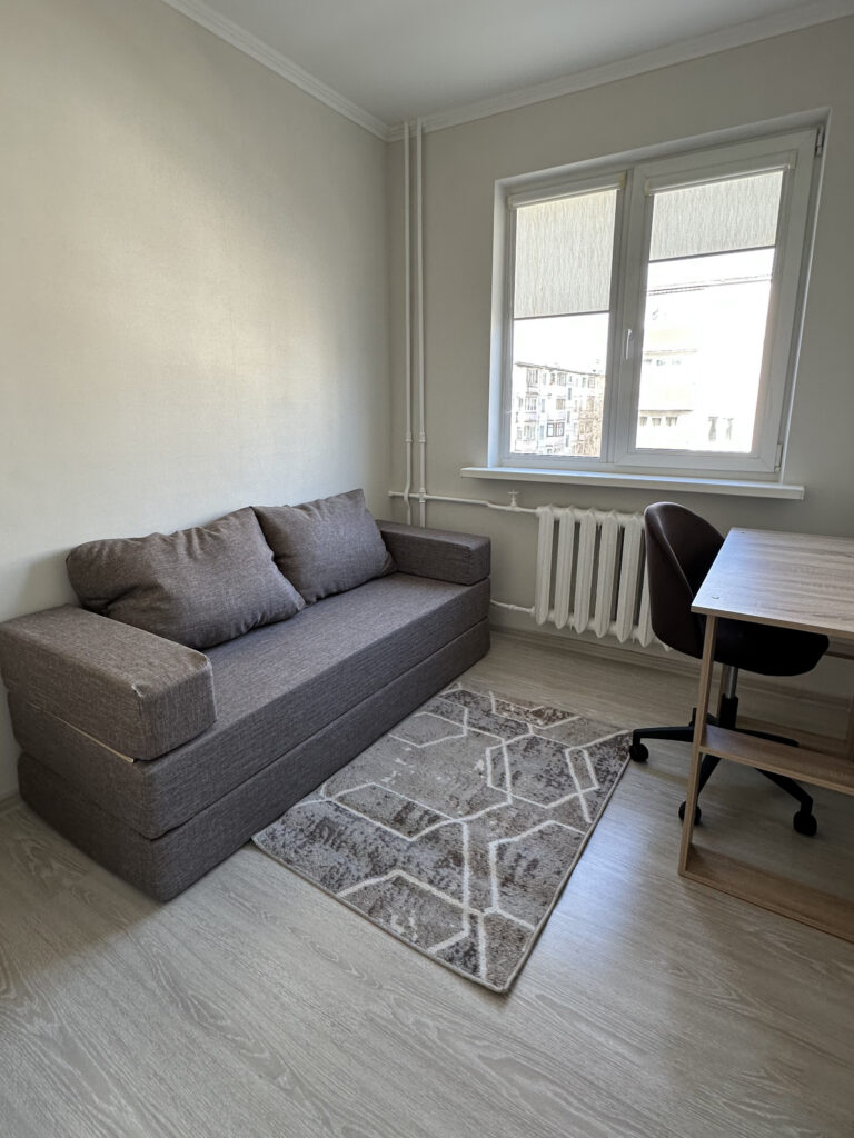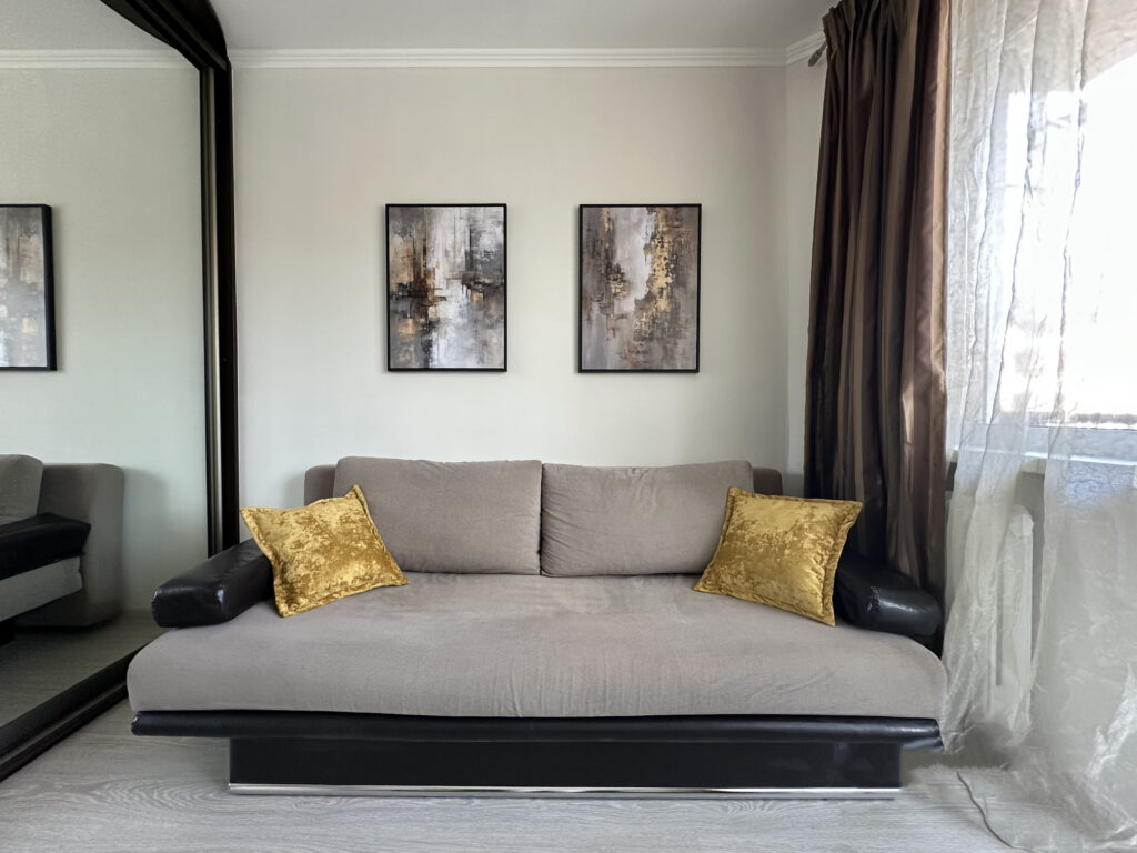 Самая большая комната квартиры — гостиная. Здесь свободно уместились шкаф, диван и телевизор, не перегружая и не захламляя пространство. Спальня по размерам меньше. Большую часть комнаты занимает шкаф-купе. Для сна предназначен раскладной диван, а для работы — стол с офисным стулом.