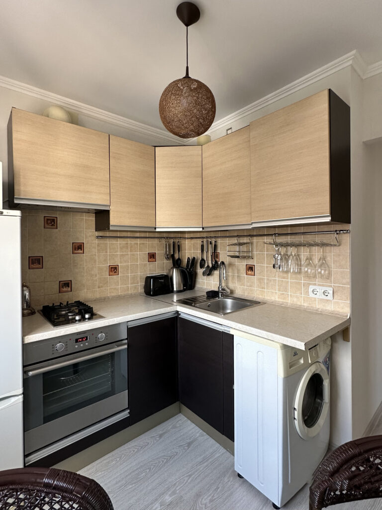Кухня также небольшая, но вмещает в себя стандартный гарнитур, холодильник, плиту и даже стиральную машину. Также здесь есть и столовый гарнитур из плетеных стульев и стола с прозрачной стеклянной столешницей.