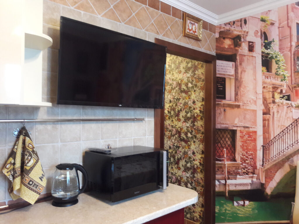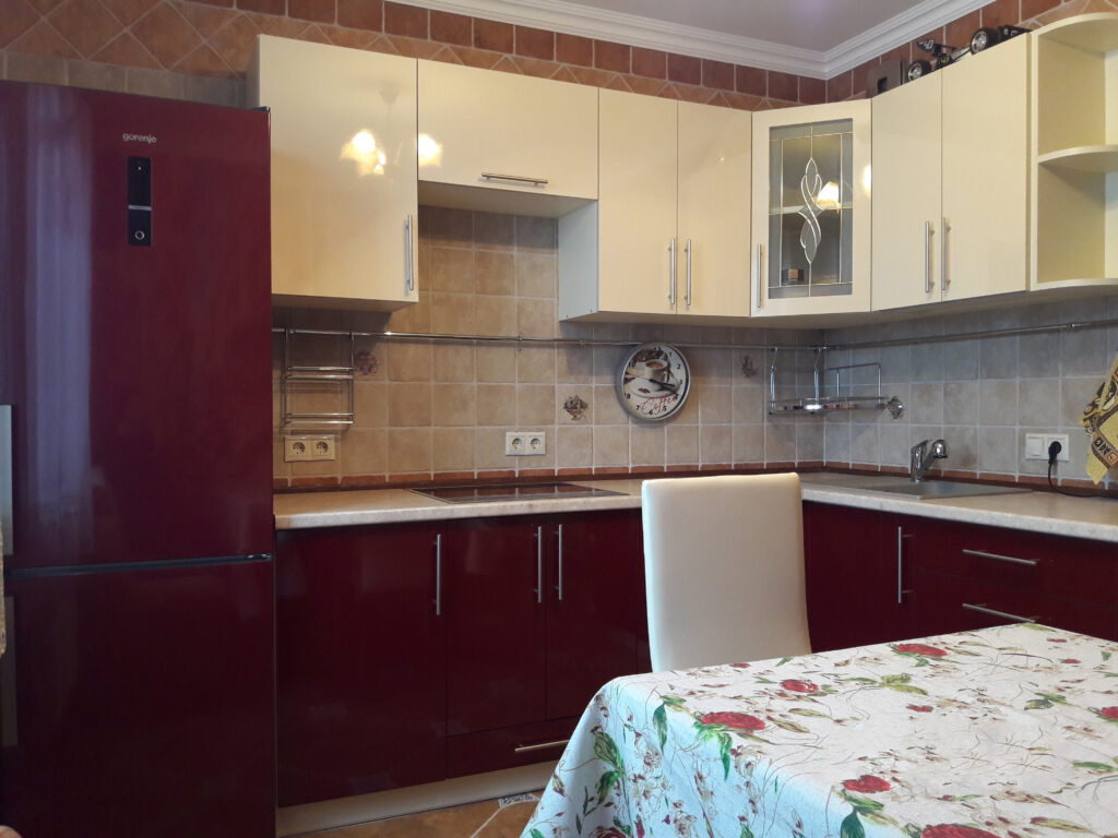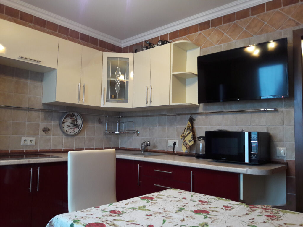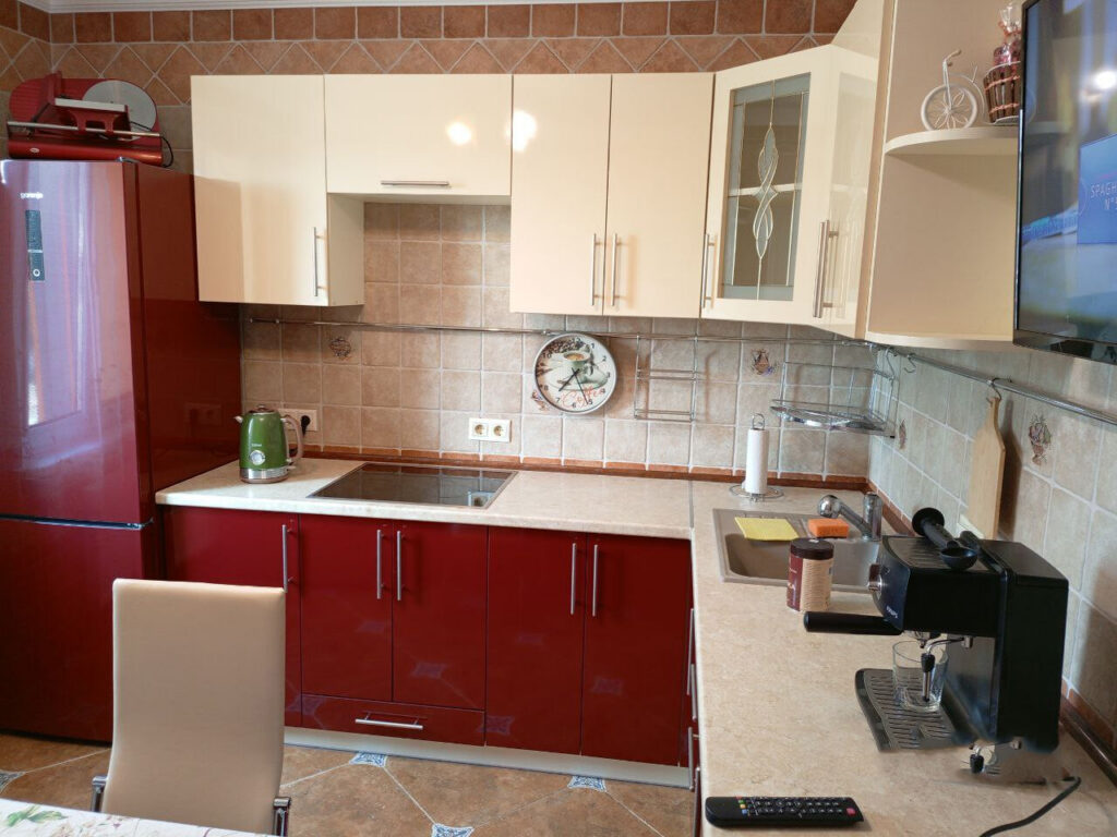 Кухня площадью 10 м² обставлена всей необходимой мебелью и техникой. Здесь есть холодильник, плита, СВЧ-печь, кофемашина, телевизор, шкафы, а также обеденный стол на шесть персон со стульями и мини-диваном.