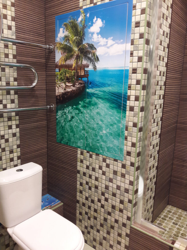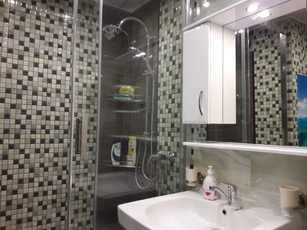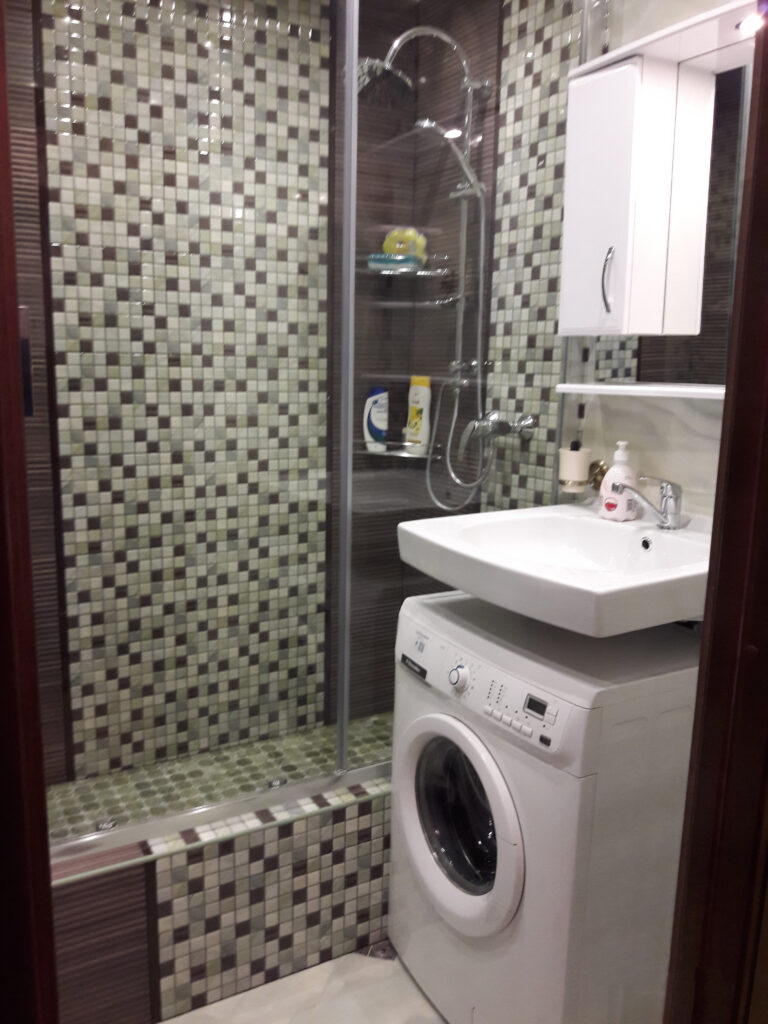 Санузел совмещенный, с тропическим душем и стиральной машиной.