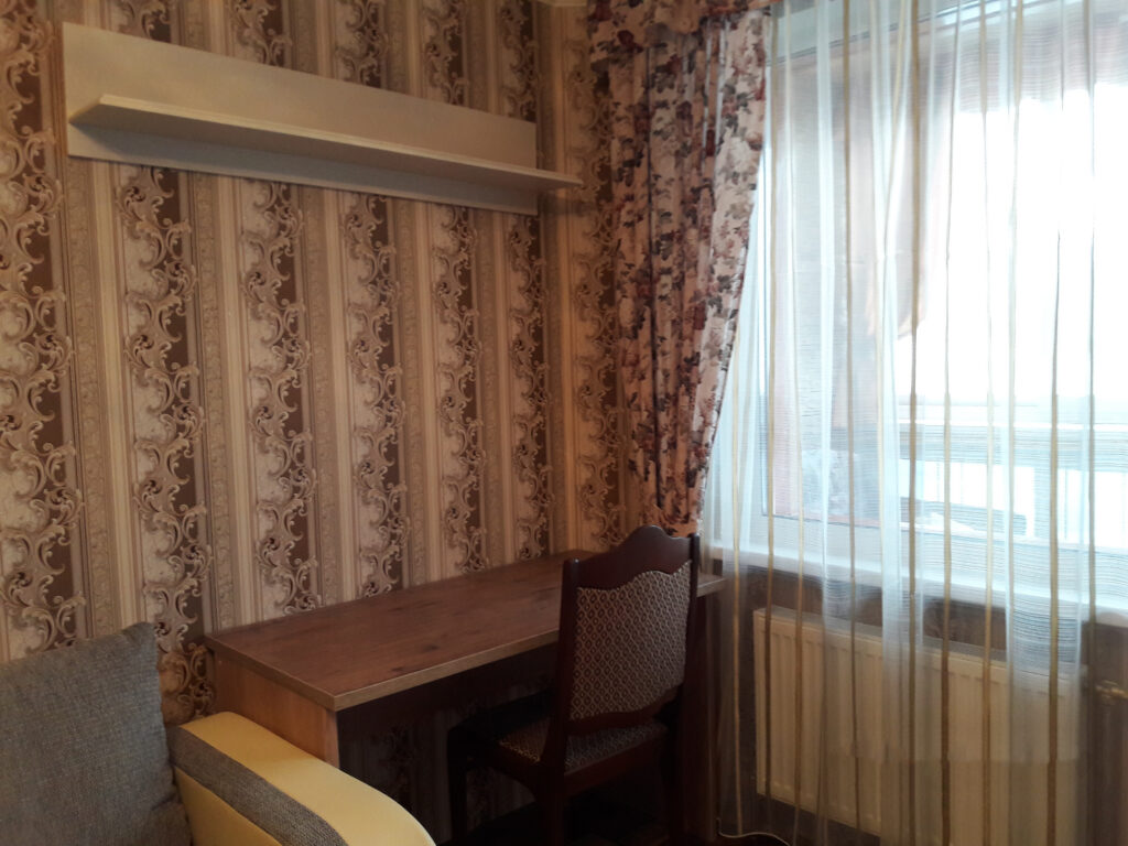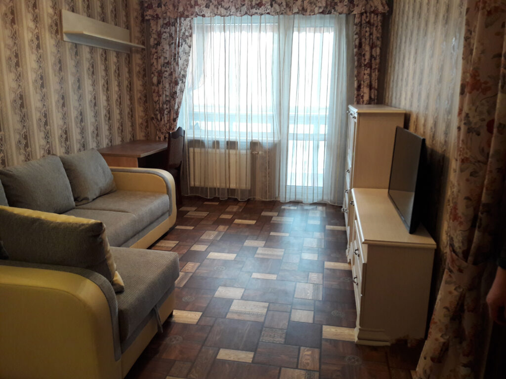 Жилая комната негласно разделена на рабочую зону и зону отдыха. Здесь стоит диван, телевизор, есть большой шкаф-купе для хранения вещей, а также письменный стол со стулом. Есть пара тумбочек и мелких шкафчиков для посуды и других предметов.