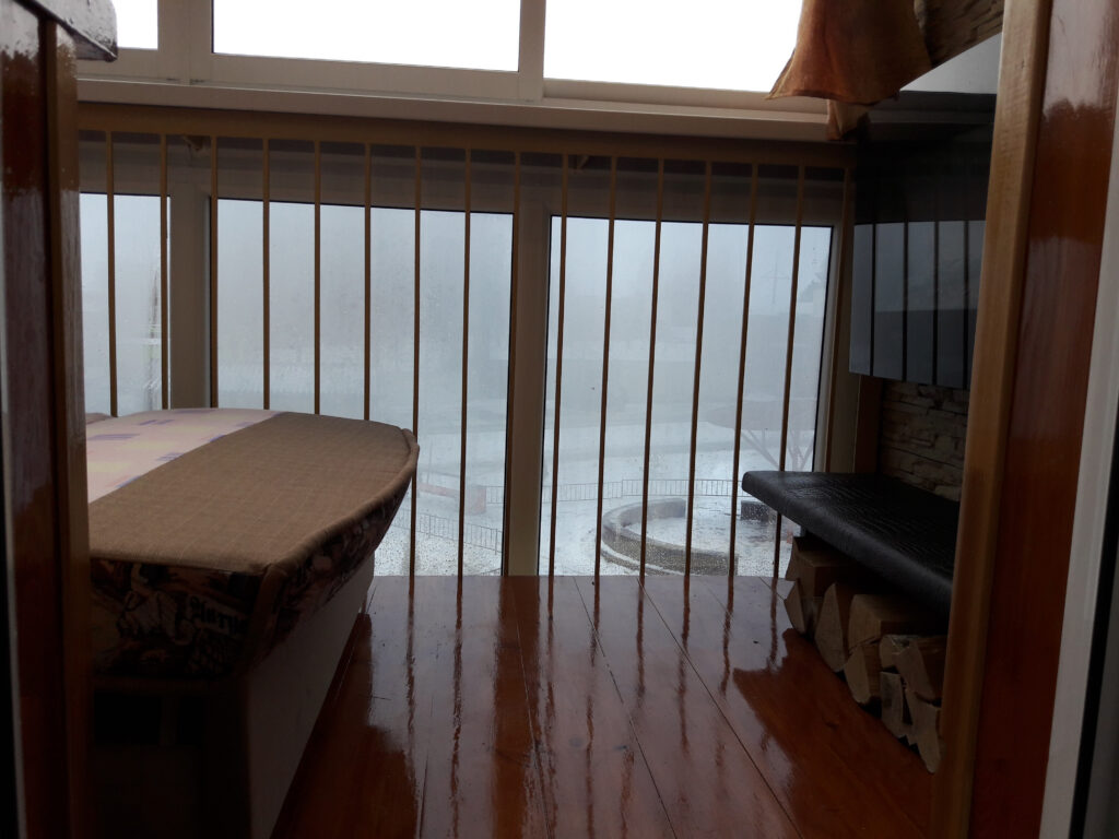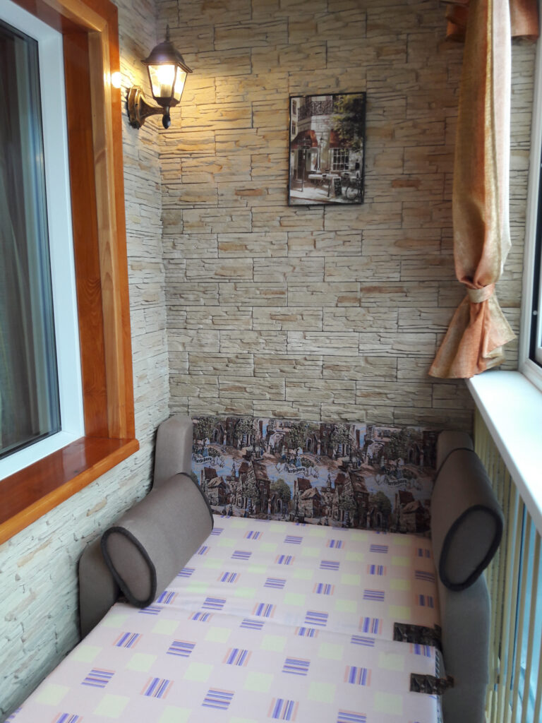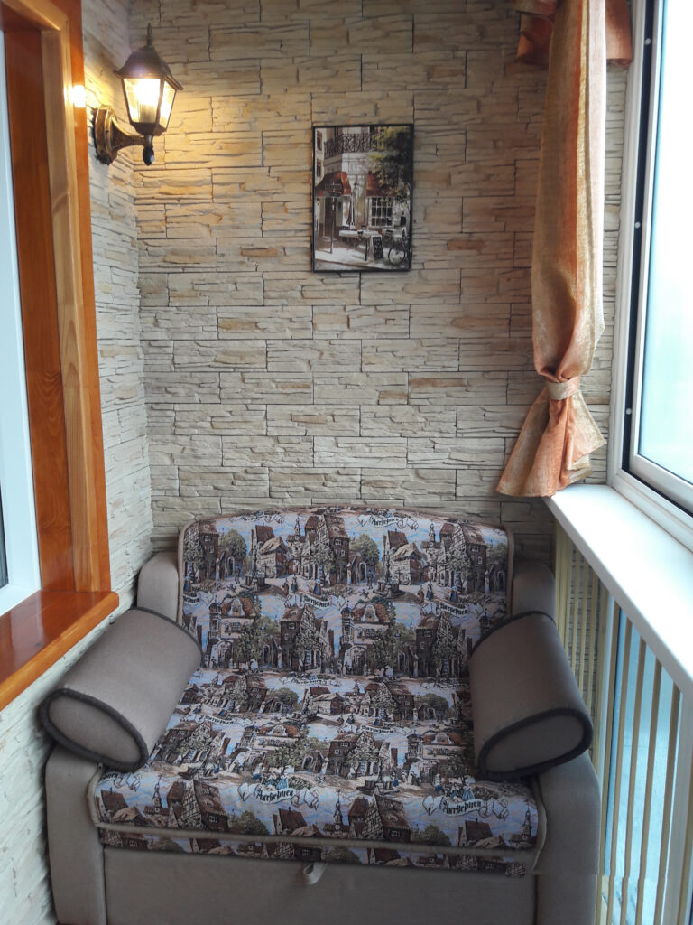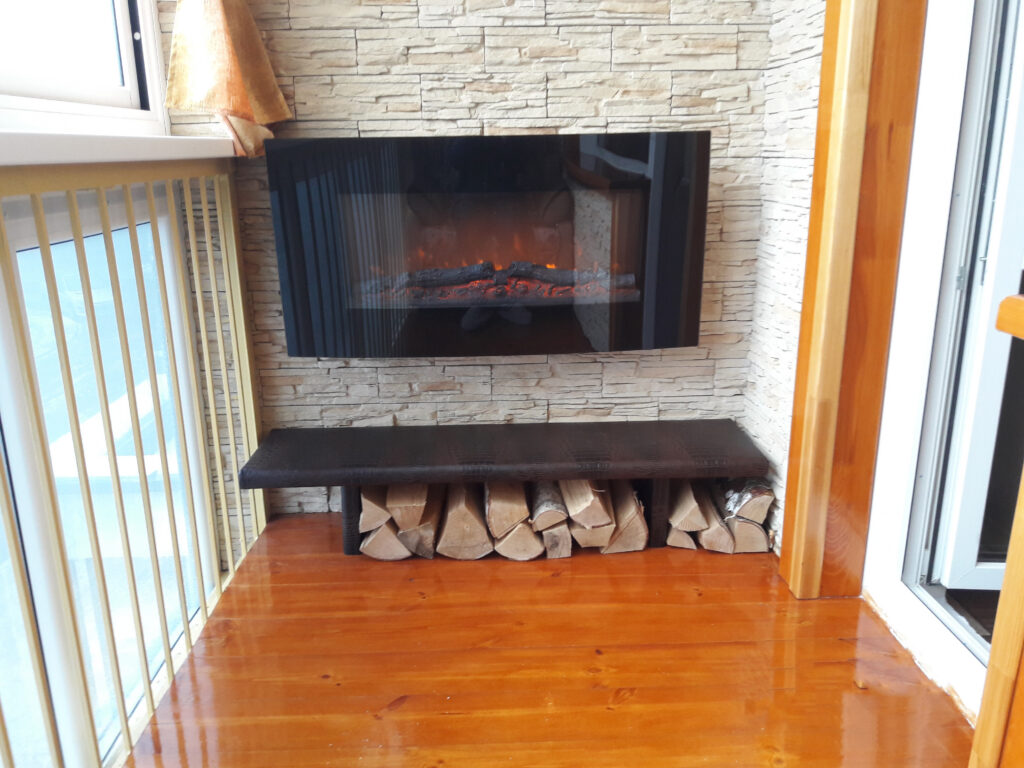 Кроме того, дополнительный жилой уголок хозяева оборудовали на балконе. Там стоит раскладная кушетка и искуственный камин с дровами для дополнительного уюта.