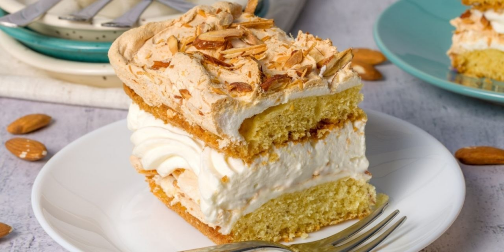 - Аккуратно распределите белковую массу поверх сырого теста, формируя небрежные пики. Обильно присыпьте поверхность миндальными лепестками. Выпекайте корж в течение 25–30 минут — до тех пор, пока меренга не станет бежевой и сухой на ощупь.