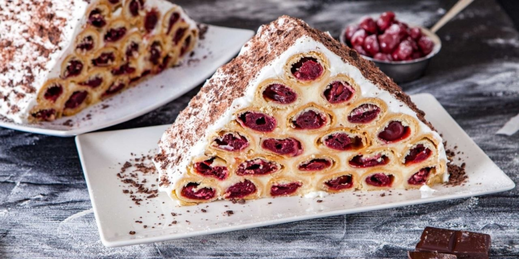 В канонической версии этого торта хозяйки замешивают песочное тесто, формуют трубочки с вишней и выкладывают из них шалаш. Мы пойдем по пути разумной экономии времени и сил. Тончайшее тесто фило из магазина — отличный вариант для тех, кто не хочет заморачиваться с готовкой. Оно выпекается моментально, хрустит выразительнее песочного собрата и впитывает минимум масла. В сочетании с кислой вишней и густой сметанной пропиткой получается десерт, достойный званого ужина.