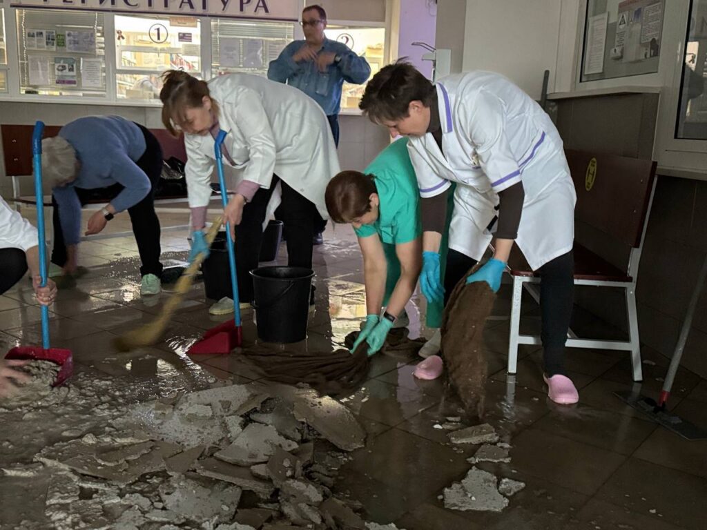 Начаты работы по ликвидации последствий подтопления. Несмотря на инцидент, лечебно-диагностический процесс в поликлинике продолжается без остановки.