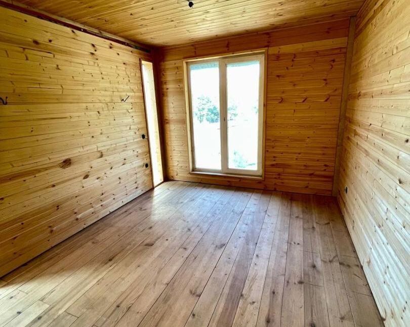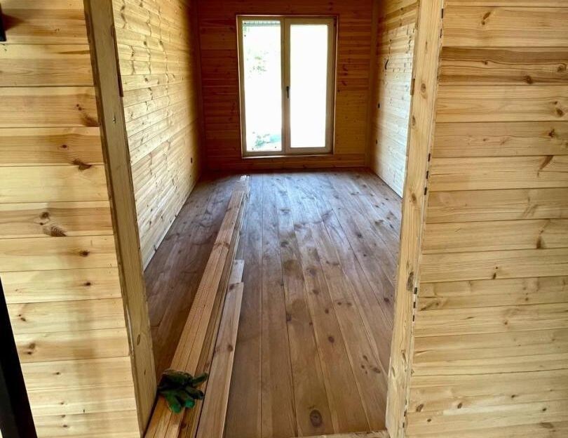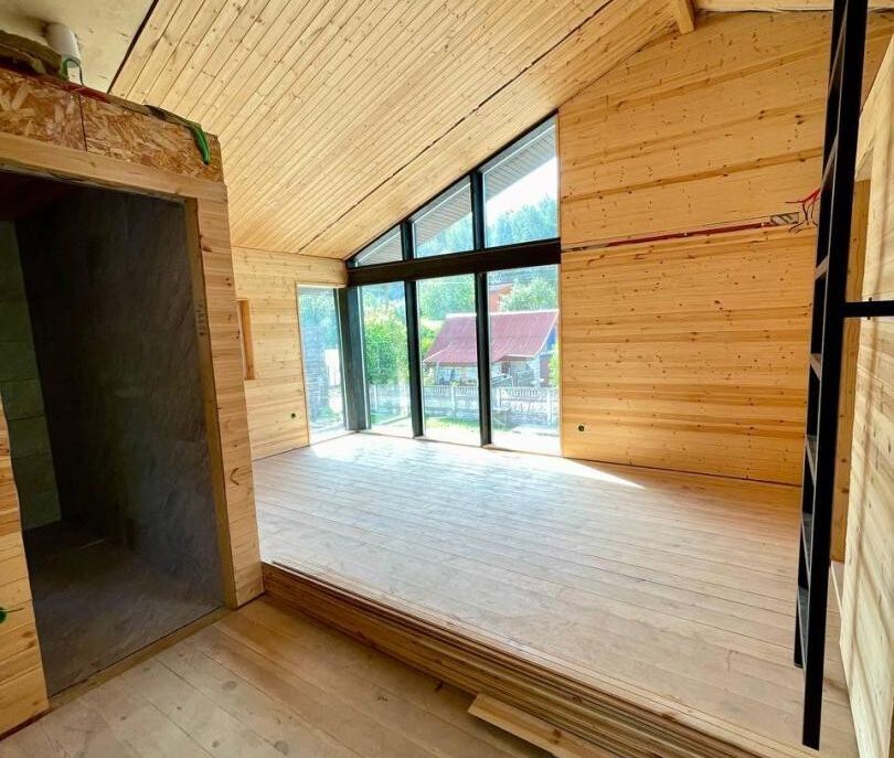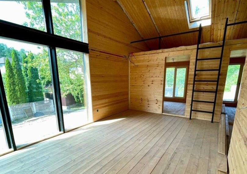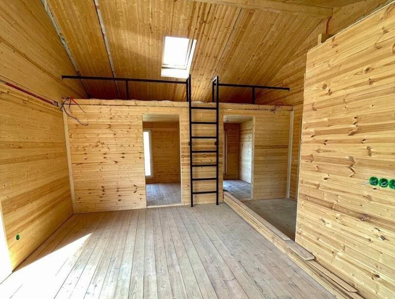 Внутреннее пространство дома продумано до мелочей. На площади в 68 квадратных метров располагаются двухсветная гостиная-кухня, две уютные спальни, санузел и антресольный этаж. Внутренние стены обшиты вагонкой «Штиль», что создает теплую и комфортную атмосферу. Полы выполнены из дерева, что добавляет уюта. На данный момент внутренняя отделка готова на 90%, и уже сейчас можно оценить продуманность планировки.