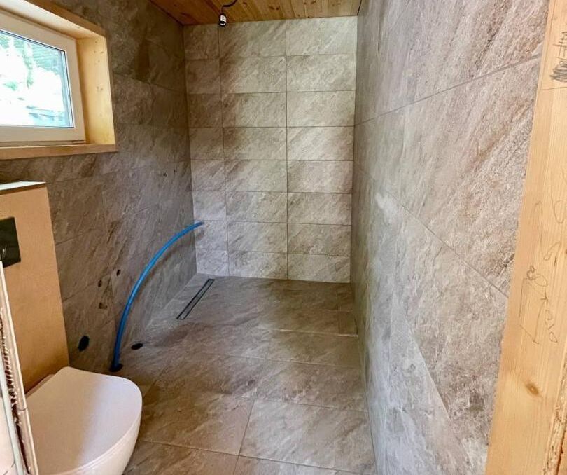 Санузел облицован современными керамическими плитками, а также оборудован теплым полом. В санузле установлены душевая кабина и инсталляция с унитазом.