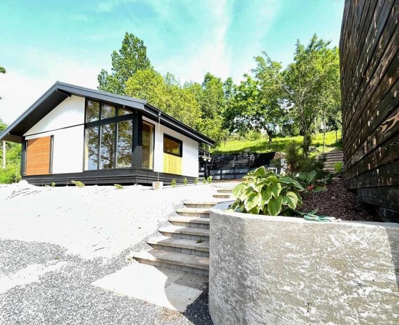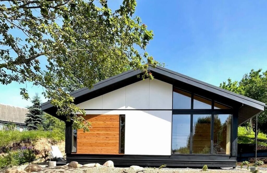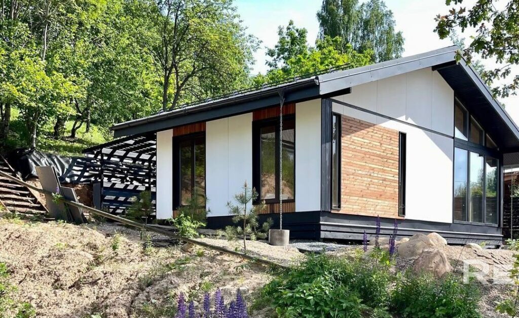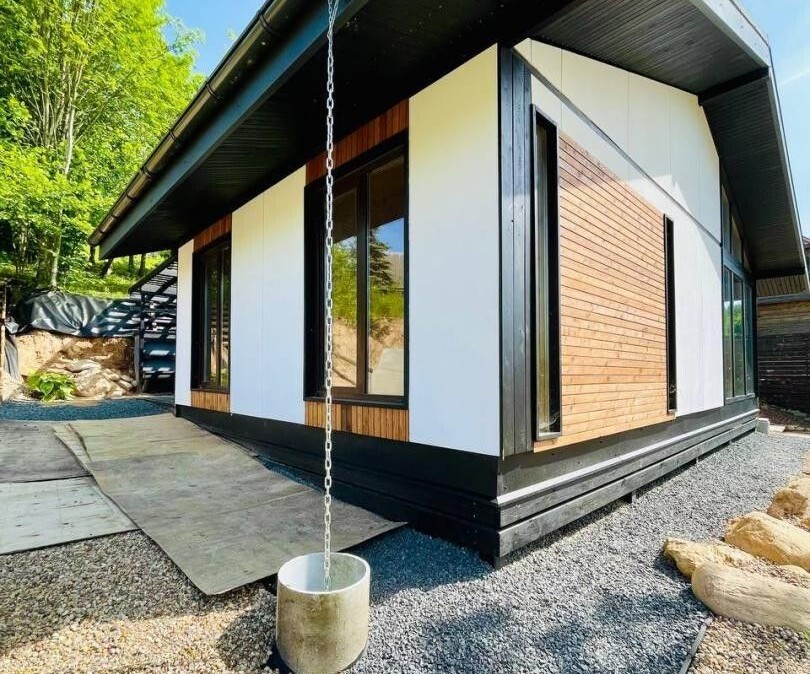 Дом был построен в 2025 году по современному архитектурному проекту, и его каркасная конструкция обеспечивает надежность и долговечность. Он стоит на металлических сваях. Стены отделаны плитами ЦСП и рейками из сибирской лиственницы, что придает дому не только эстетичный вид, но и дополнительную защиту от внешних факторов. Кровля выполнена в виде фальца, что обеспечивает надежную защиту от осадков, а окна и двери изготовлены из качественного ПВХ, что также способствует хорошей теплоизоляции.