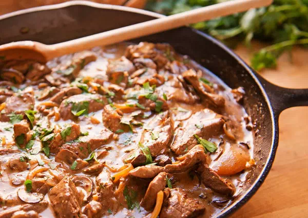 Нежные полоски говядины в сметанном соусе встречаются с ароматными лесными грибами. Подосиновики, с их плотной мякотью и благородным вкусом, отлично дополняют мясо.