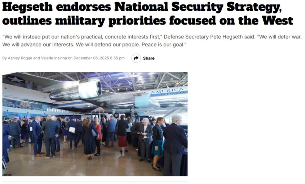 Стратегия объявляет «коррекцию Трампа» — восстановление американского доминирования в Западном полушарии. Хегсет формулирует: «После многих лет пренебрежения Соединённые Штаты восстановят военное доминирование в Западном полушарии».