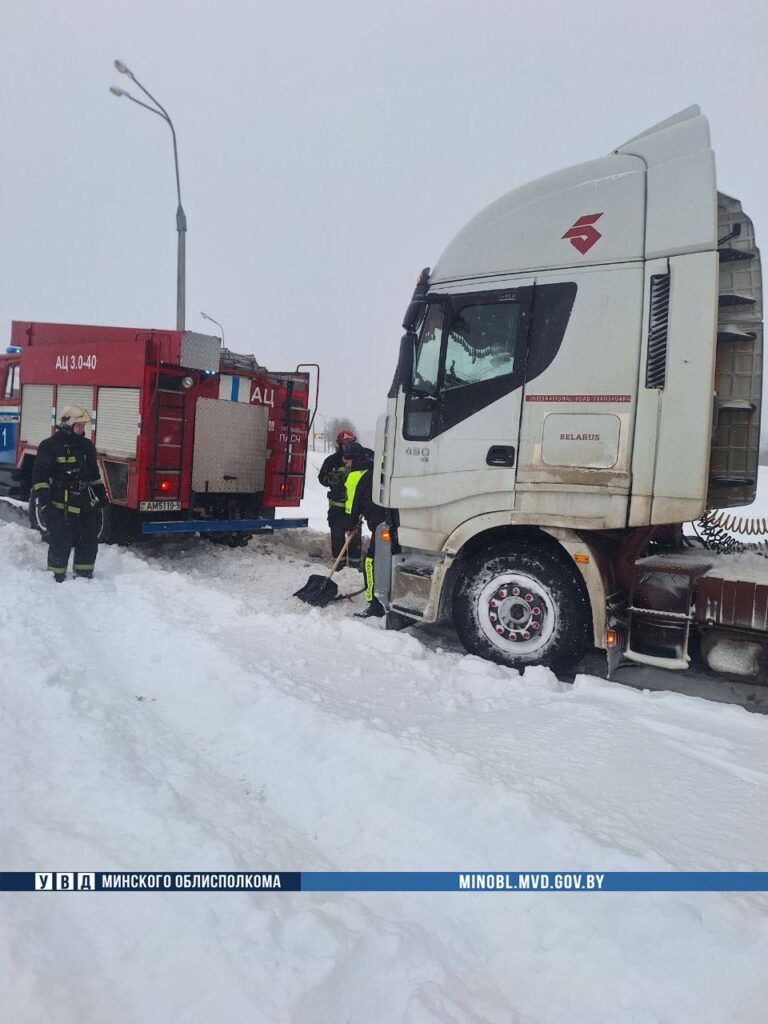 Сотрудники ГАИ Минского РУВД оперативно обратились за поддержкой в МЧС. Спасатели и стражи дорог совместными усилиями вытащили первую фуру на проезжую часть трассы.