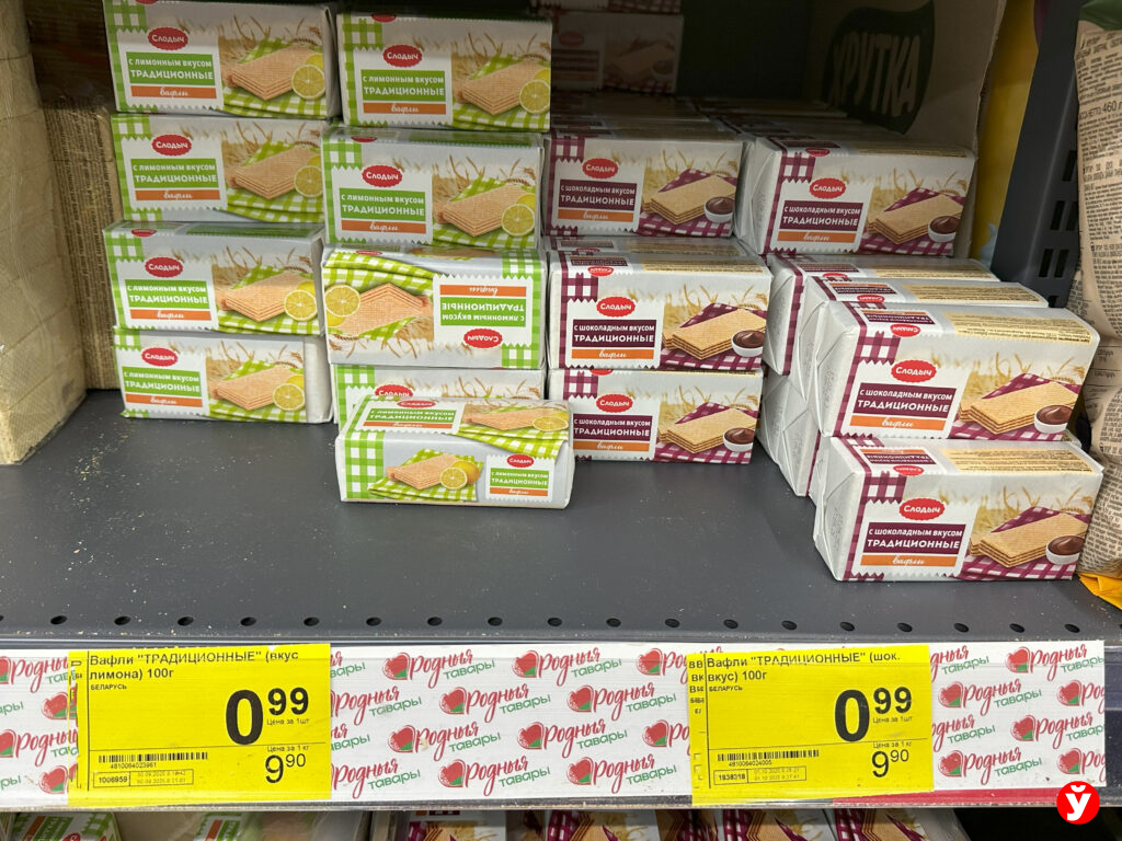 Вафли побольше — со вкусом лимона или шоколада — стоят всего 99 копеек за 100 грамм.