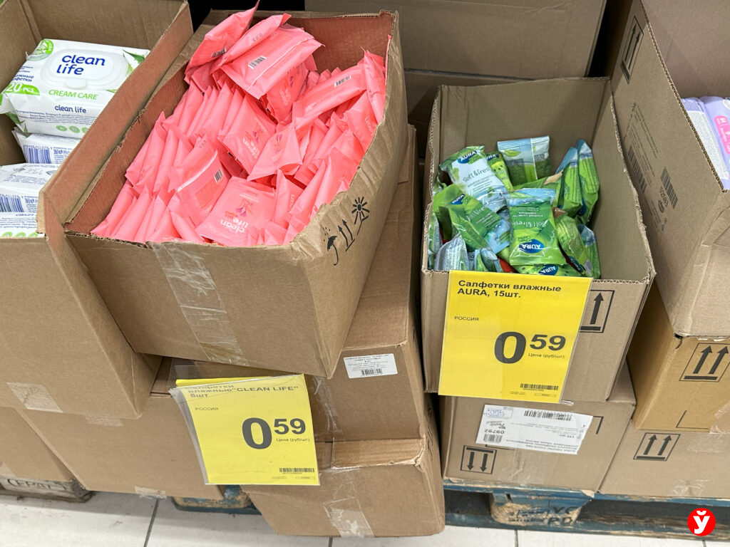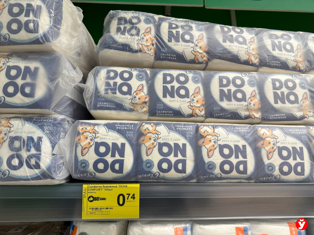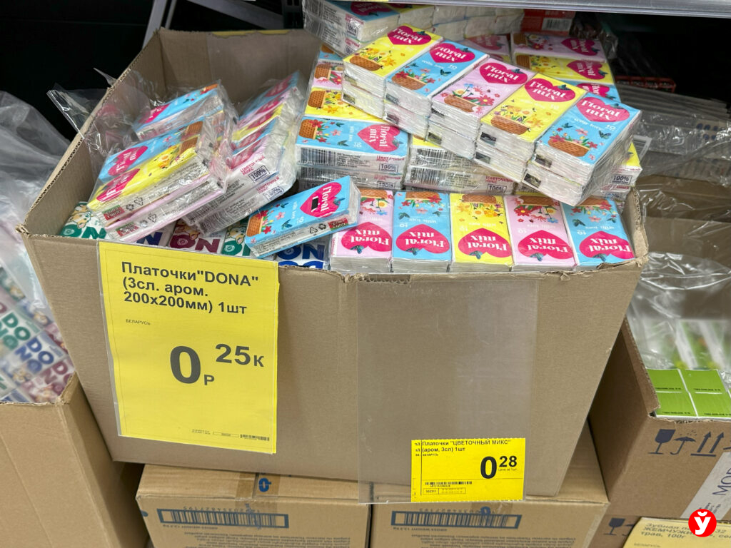 Бумажные сухие салфетки (100 штук) — 74 копейки, а трехслойные носовые платочки можно приобрести за невероятные 25 копеек за упаковку.