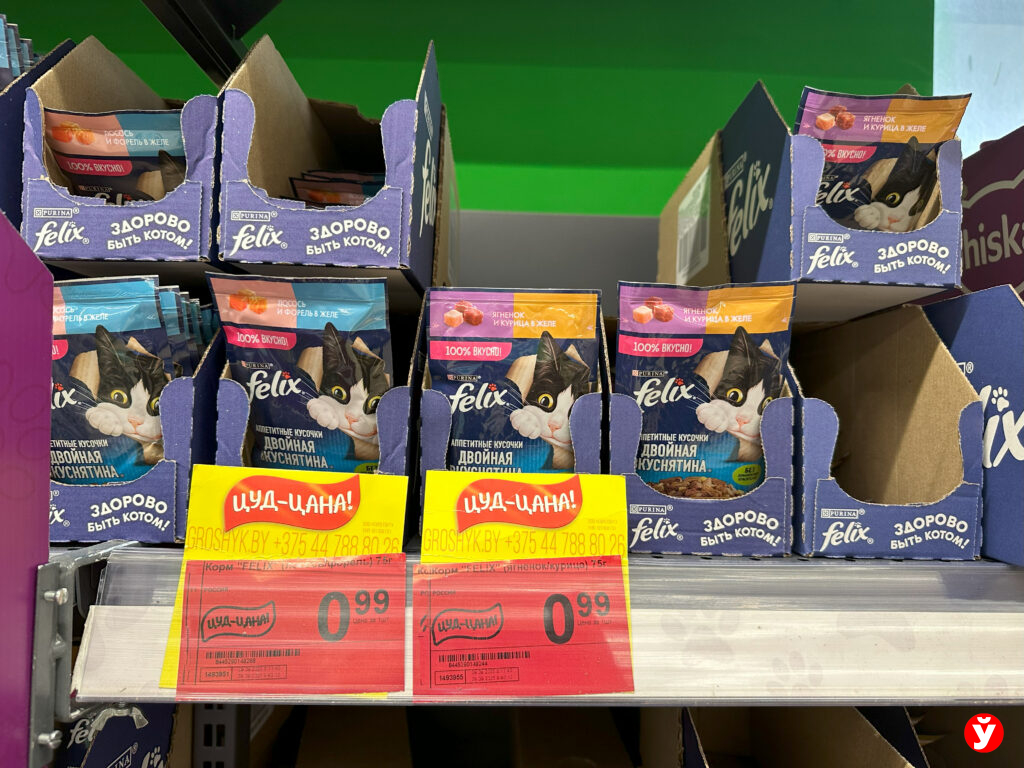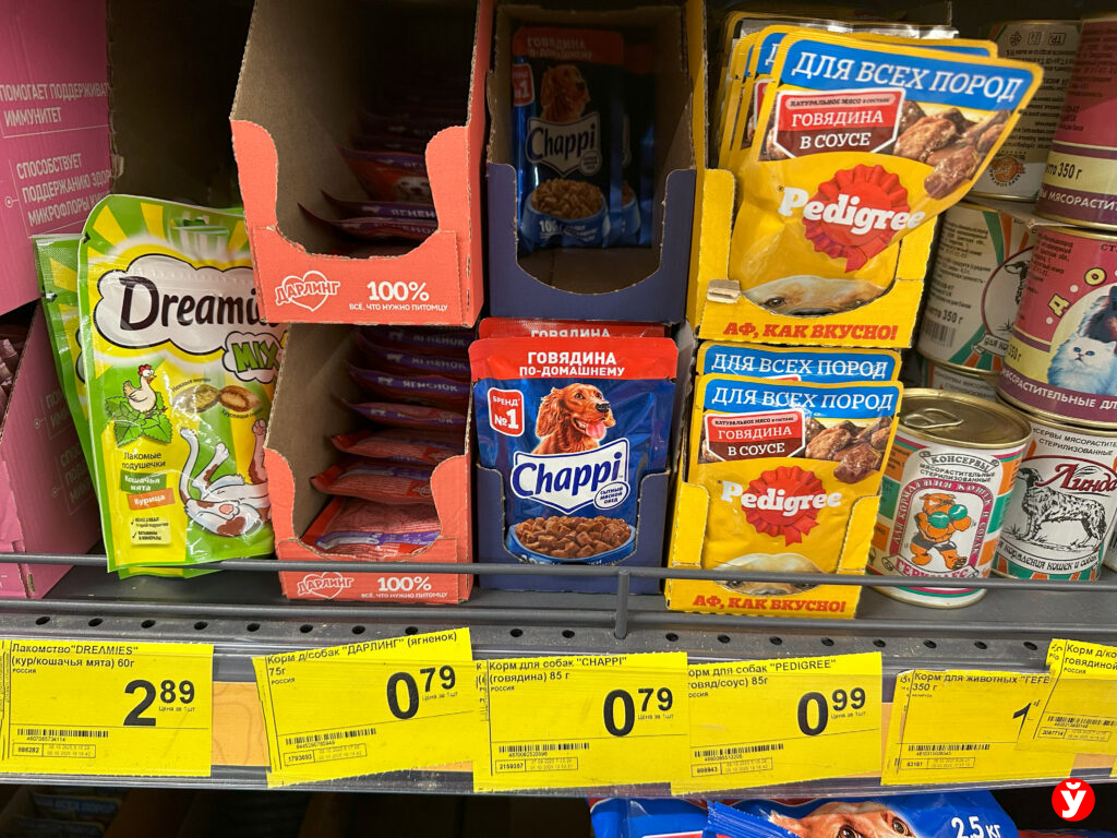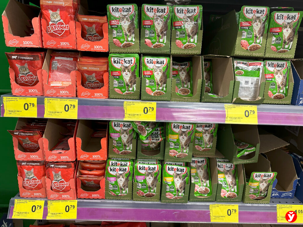 Ассортимент для котов тоже велик — цены колеблются от 79 до 99 копеек.
