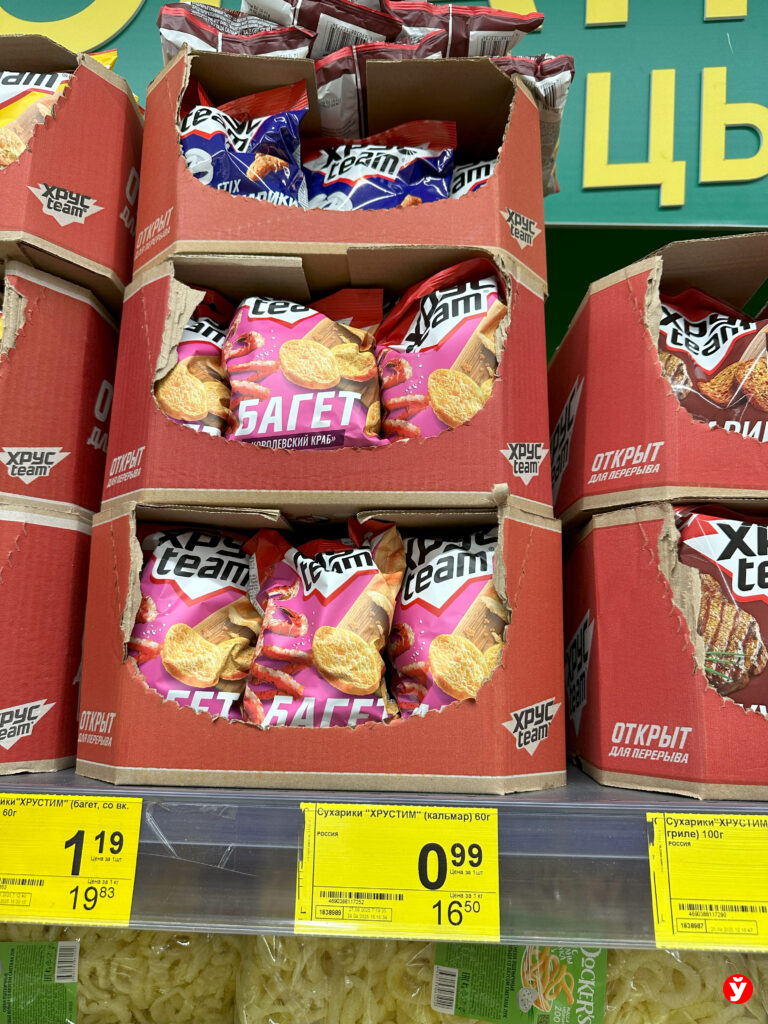 А для тех, кто хочет вечером похрустеть чем-нибудь перед телевизором, советуем обратить внимание на вермишельные снеки со вкусом пиццы (79 копеек за 60 грамм) и сухарики со вкусом кальмара (99 копеек за 60 грамм).