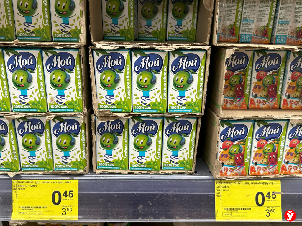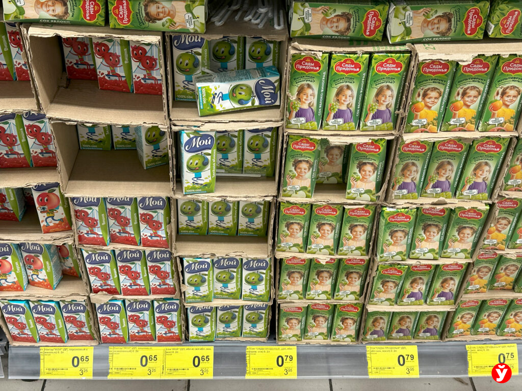 Соки с разнообразными вкусами — от мультифрукта до яблока и вишни — стоят от 89 до 92 копеек за упаковку.