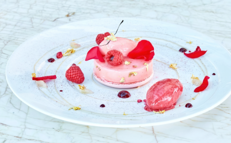 - Перед подачей украсьте десерт лепестками роз, свежей малиной и шариком малинового шербета. Этот контраст температур и текстур сделает дегустацию незабываемой.