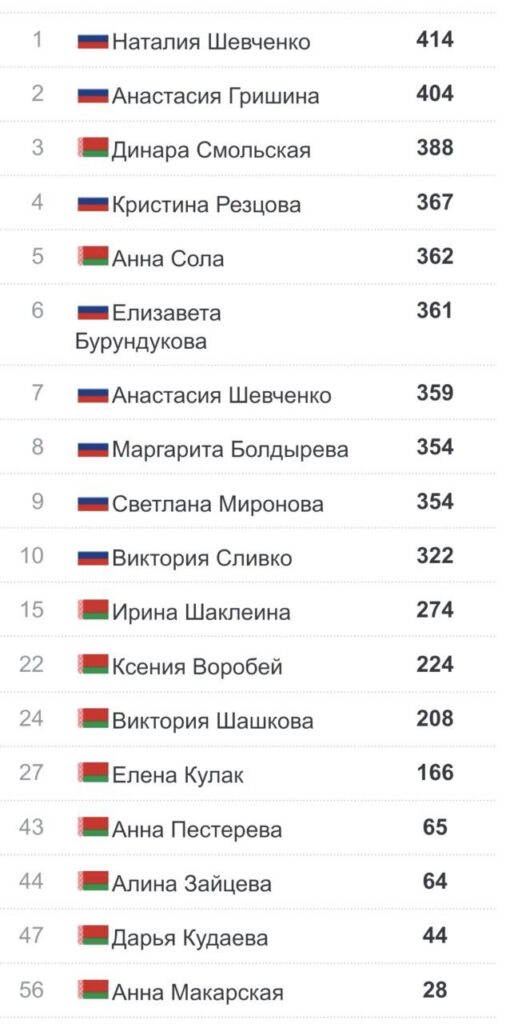 У девушек лидерство удерживает Наталия Шевченко из России: на ее счету 414 очков. На 10 баллов меньше у еще одной россиянки Анастасии Гришиной. Набрав 388 пунктов на третьей строке идет наша Динара Смольская. Ей 21 балл проигрывает Кристина Резцова и 26 еще одна белоруска Анна Сола, идущая пятой в тотале. Замыкает десятку лучших Виктория Сливко из России. Ирина Шаклеина — 15-я и 274 очка, Ксения Воробей — 22-я, это 224 балла, Виктория Шашкова — 24 (208 пунктов), Елена Кулак — 27-я (166), Анна Пестерева — 43-я (65), Алина Зайцева — 44-я (64), Дарья Кудаева — 47-я (44), Анна Макарская — 56 (28).