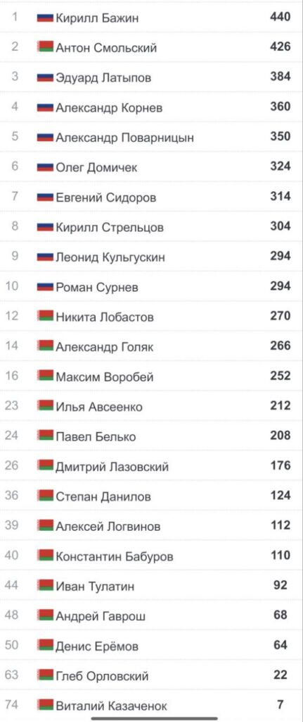 У парней первую строку занял Кирилл Бажин (Россия). В его активе 440 очков. Белорус Антон Смольский второй, у капитана нашей сборной 426 баллов. Эдуард Латыпов тройку замыкает — 384 пунктов. Никита Лобастов — 12-й (270), Александр Голяк — 14-й (266), Максим Воробей — 16-й (252).