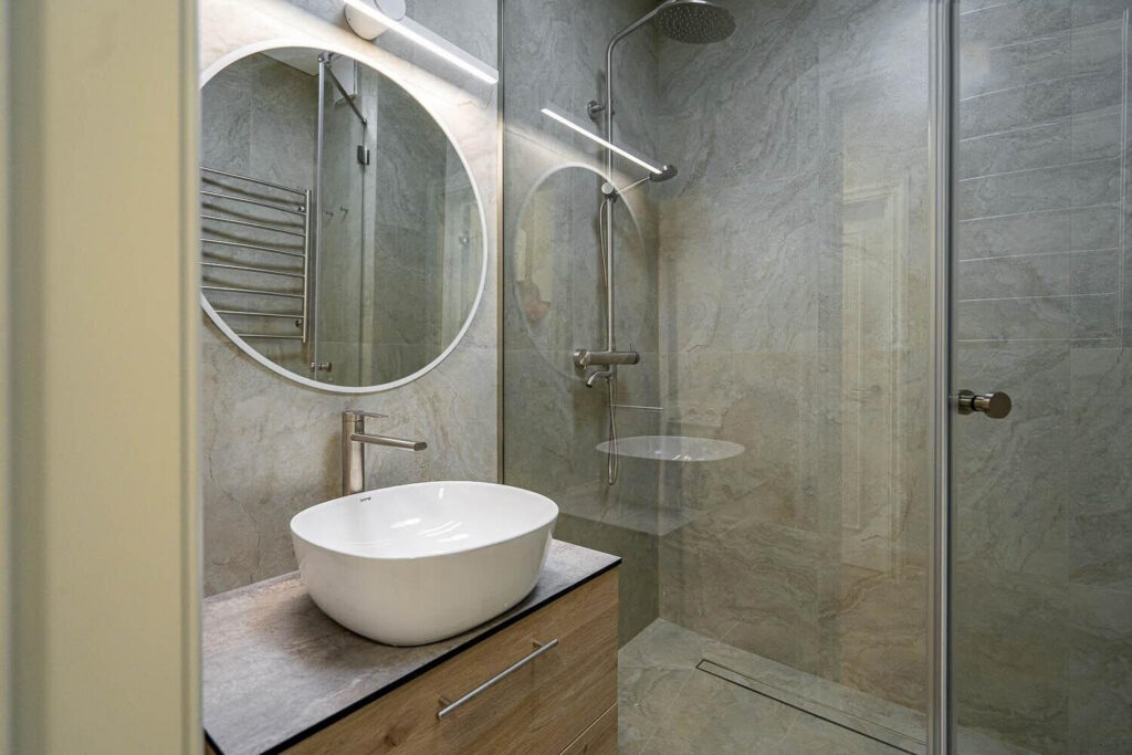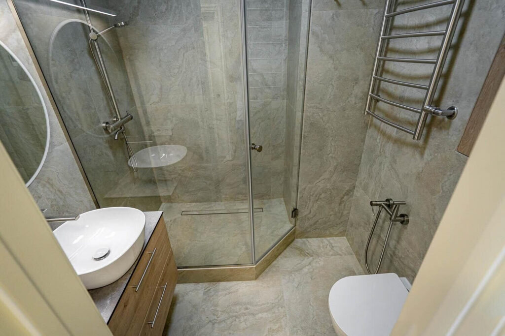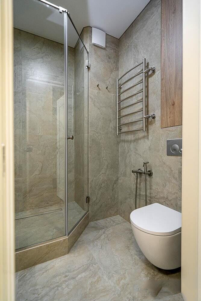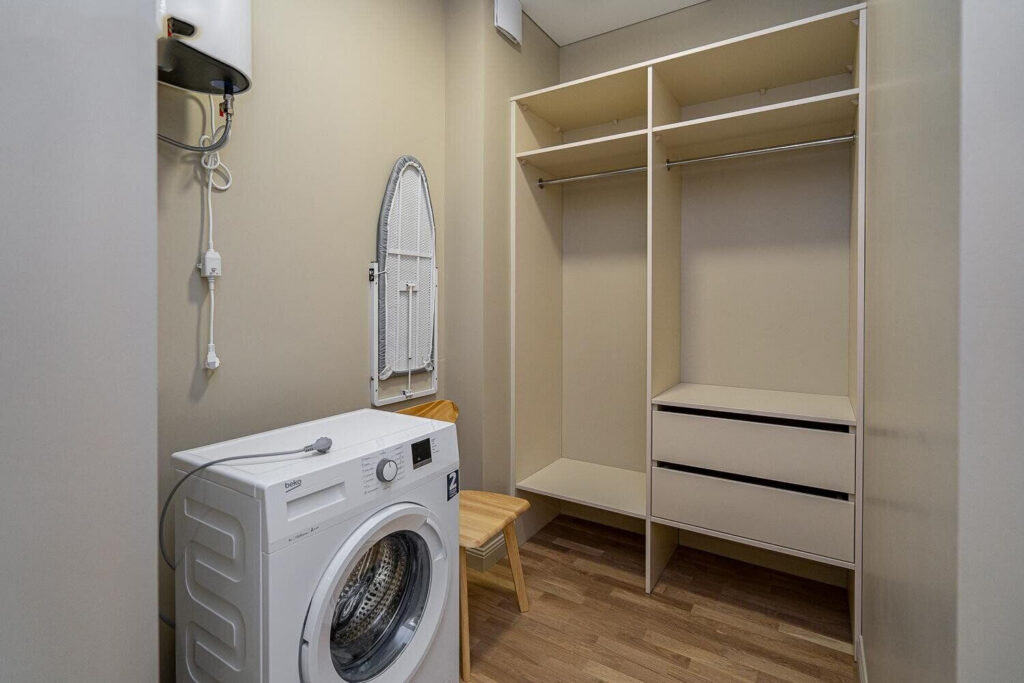 Также в квартире имеется вместительная гардеробная со стиральной машиной и оборудованием для глажки. Санузел совмещенный с душевой кабиной и полотенцесушителем. На случай отключения горячей воды имеется бойлер.