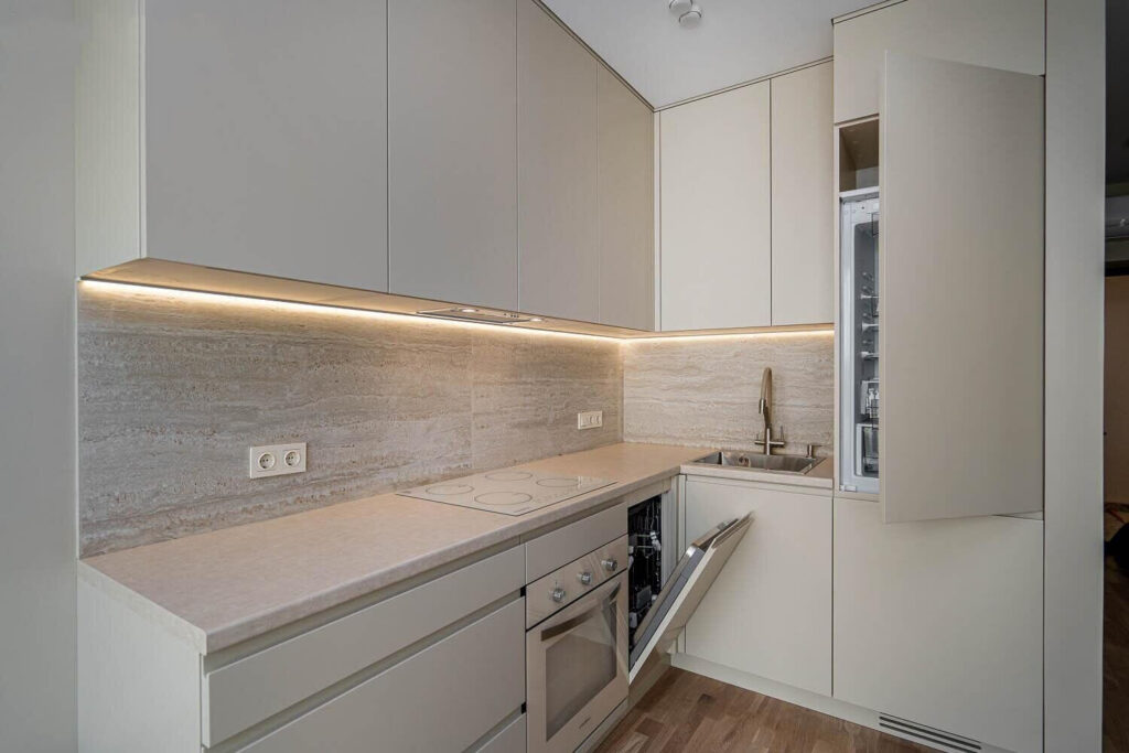 Жилье разделено на кухню и спальню. Кухня полностью укомплектована всей необходимой техникой: посудомоечная машина, кондиционер, холодильник, плита, также есть диван и столовый гарнитур. В спальне стоит двухспальная кровать и шкафы. Есть застекленный балкон, но он без мебели.