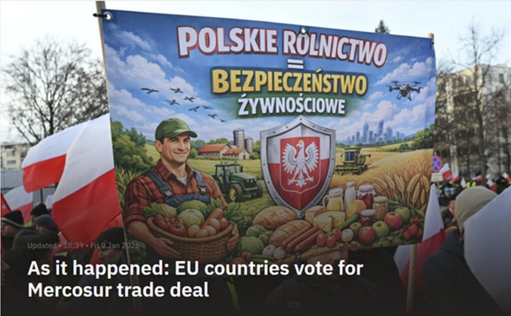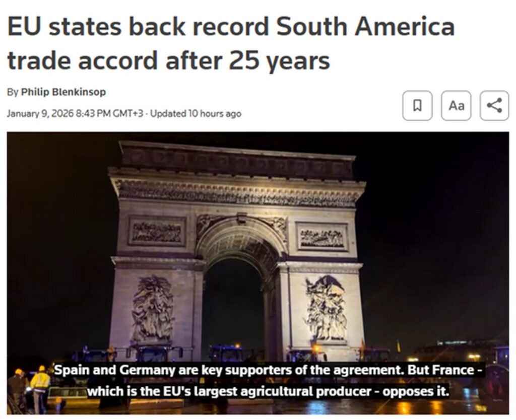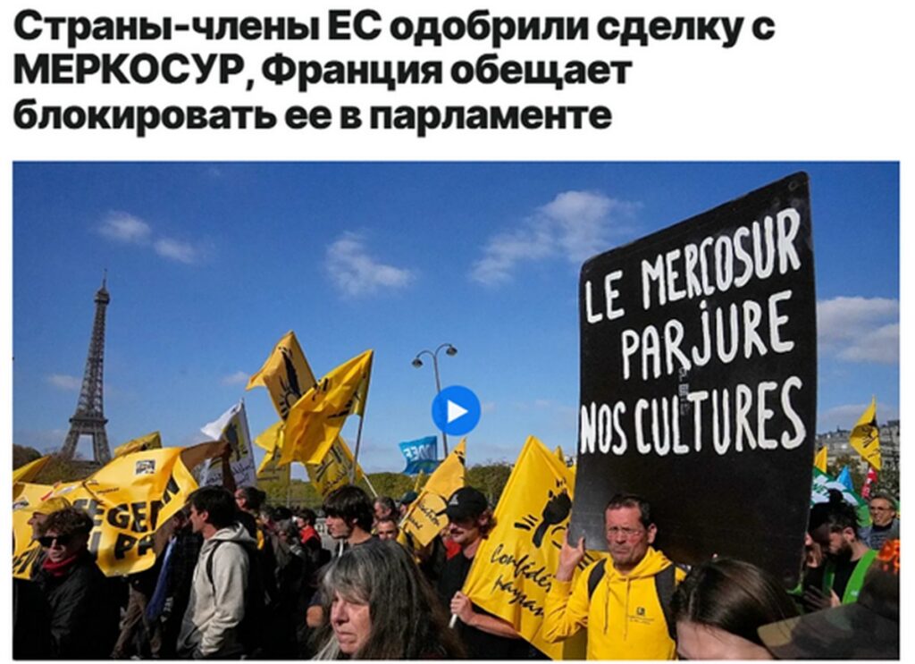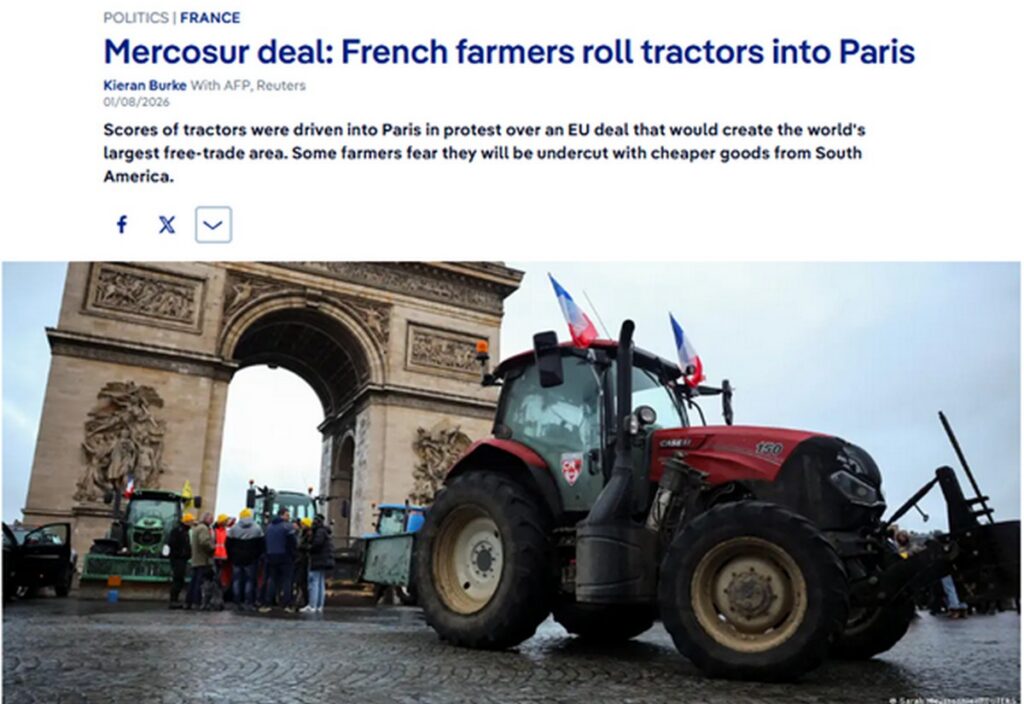 17 января 2026 года Урсула фон дер Ляйен отправится в Парагвай официально подписать соглашение ЕС-МЕРКОСУР, которое станет одним из крупнейших в мире. Этот момент будет преподнесён как триумф дипломатии, но за ним стоят тысячи фермеров, которые в тот самый день будут блокировать дороги в Париже, Варшаве, Дублине, требуя отменить сделку и провести референдум.