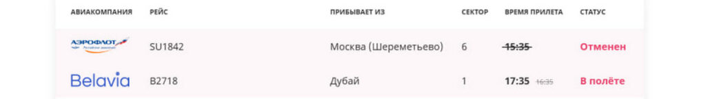 На сайте Национального аэропорта указано, что отменен рейс на 16:25 в Москву. Также отменлио рейс прибытием в 15:35 из Москвы. Рейс из Дубая прибудет в 17:35 вместо 16:35.
