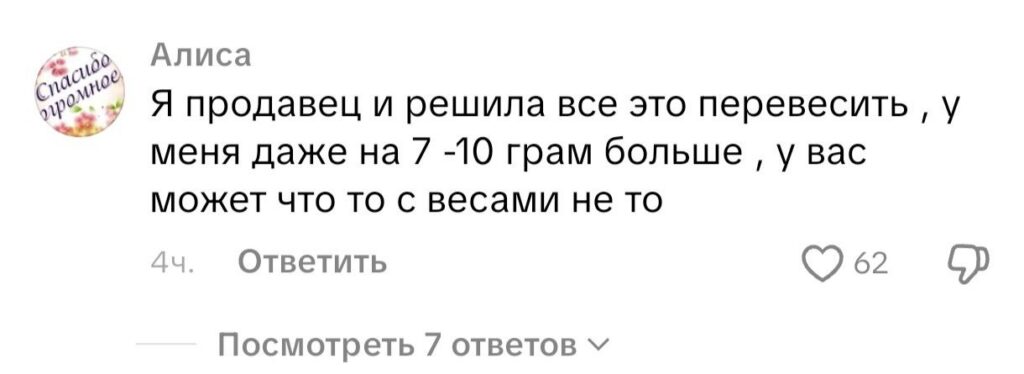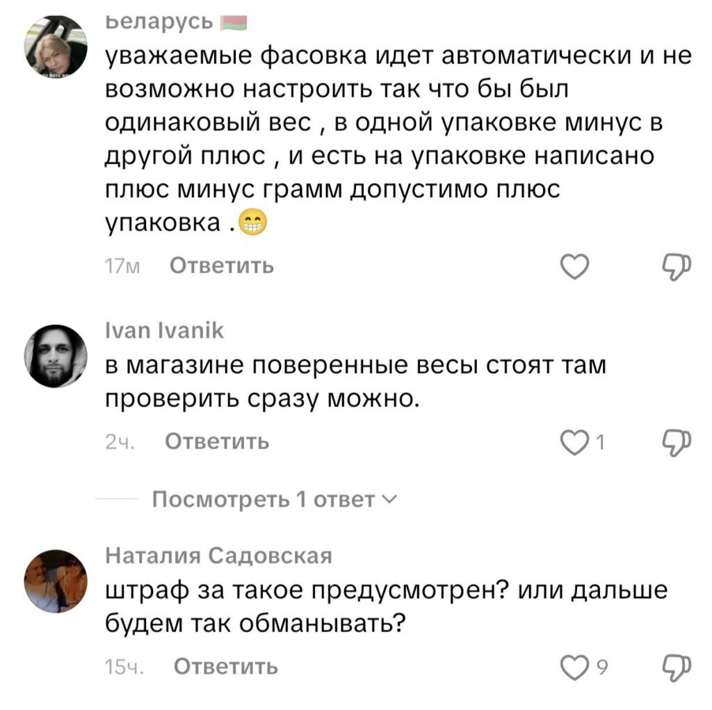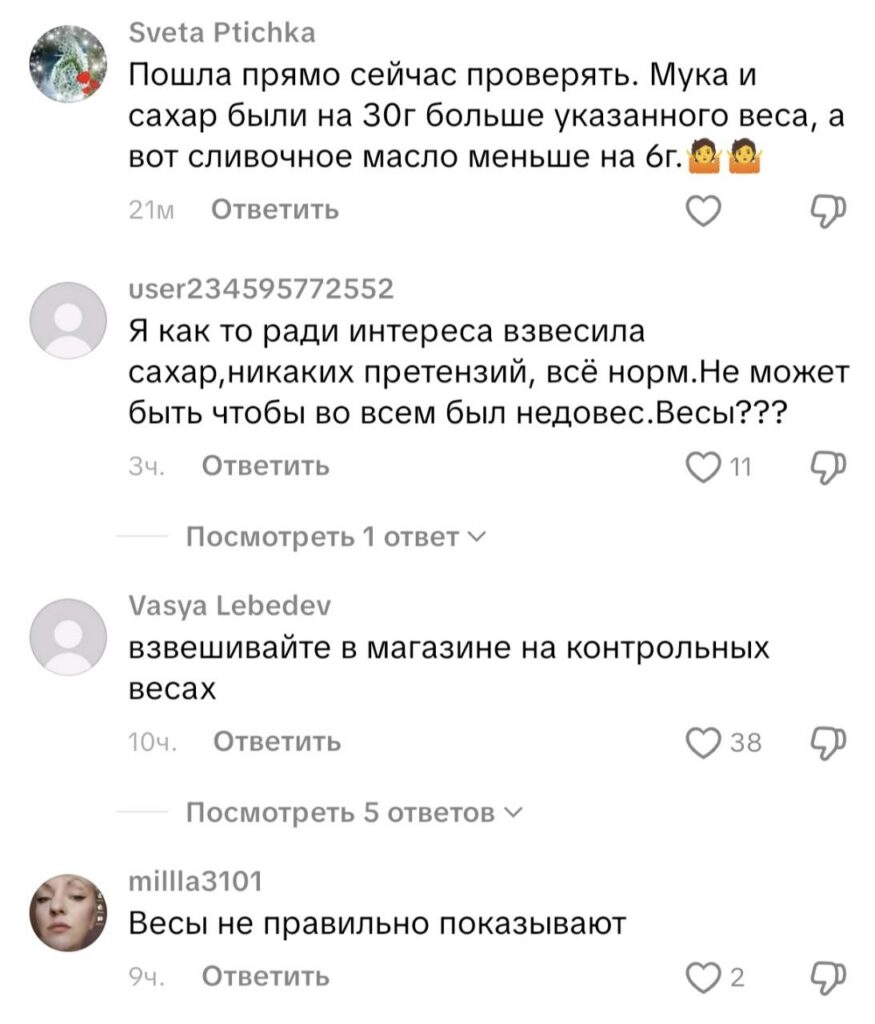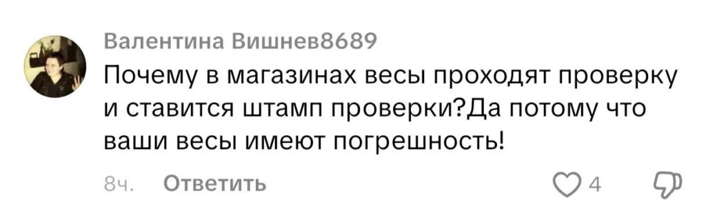 «Я продавец и решила все это перевесить, у меня даже на 7 — 10 грамм больше, у вас может что-то с весами не то», — высказал свое экспертное мнение один из тиктокеров. «Почему в магазинах весы проходят проверку и ставится штамп проверки? Да потому что ваши весы имеют погрешность!» — справедливо отметил второй.