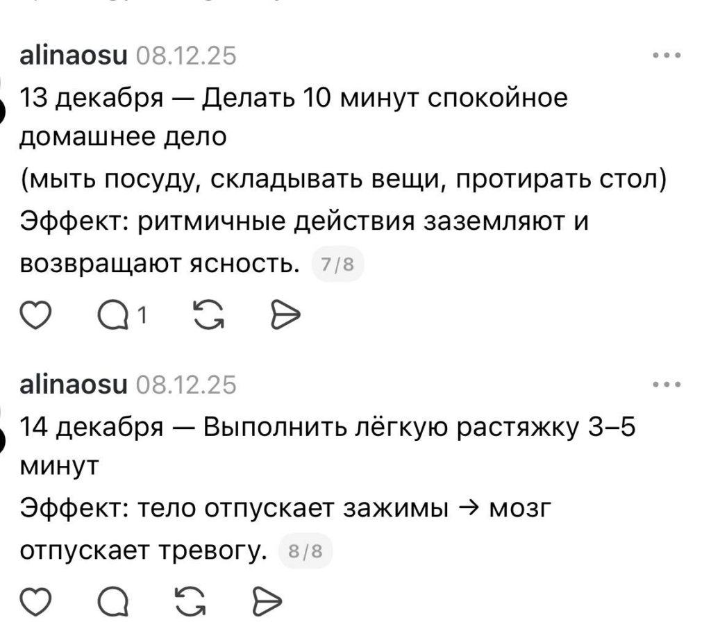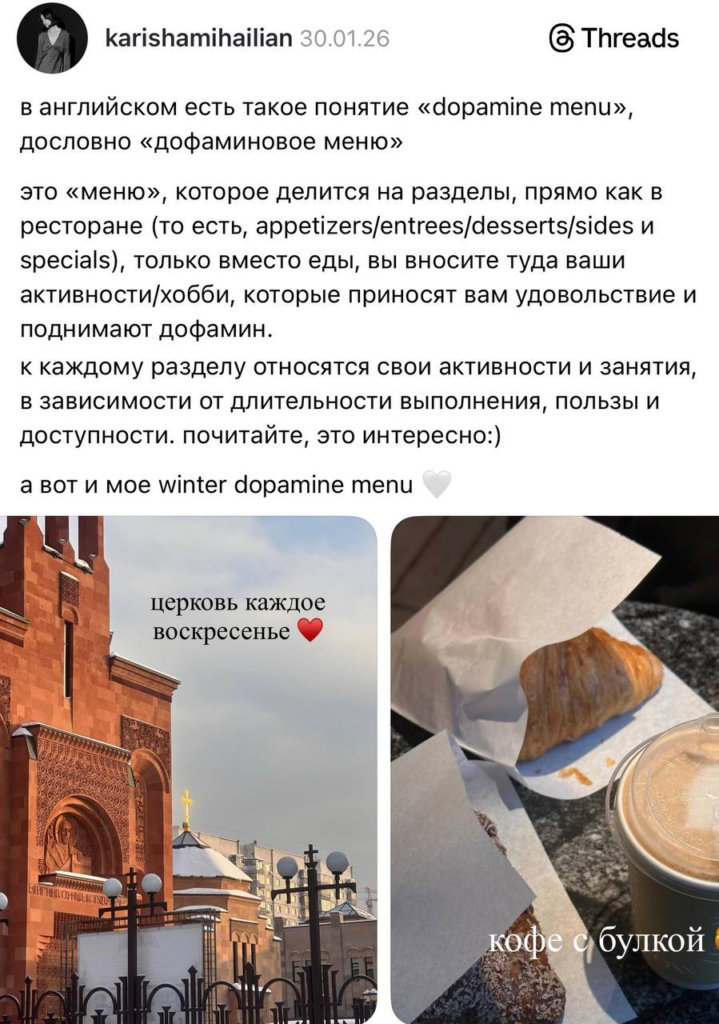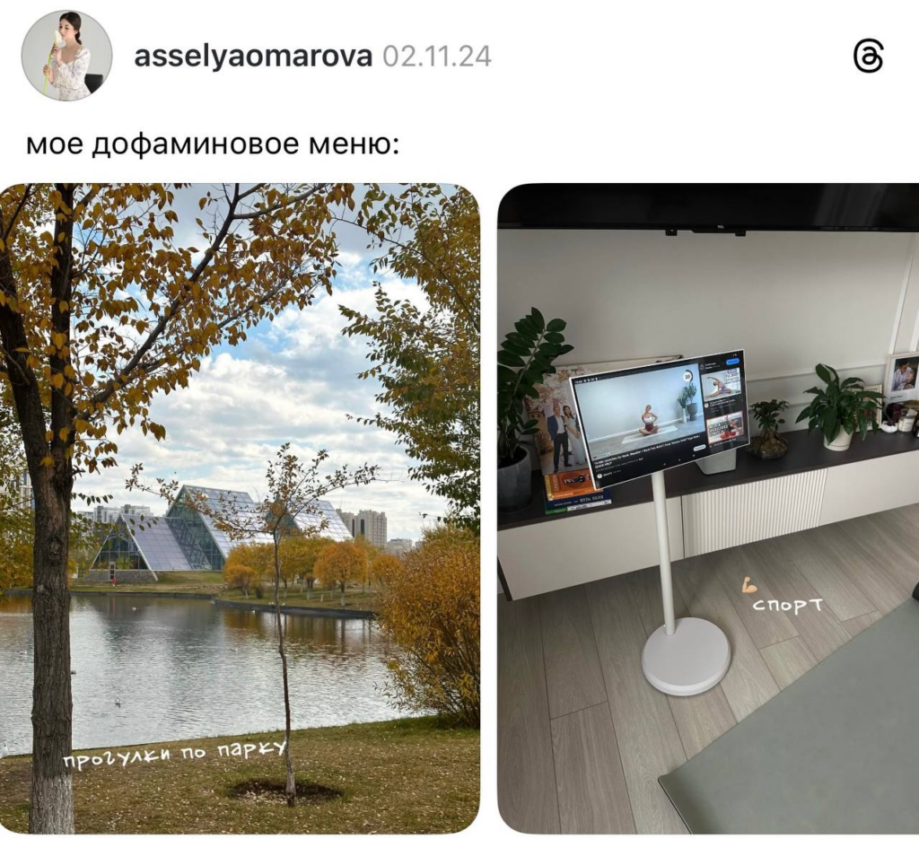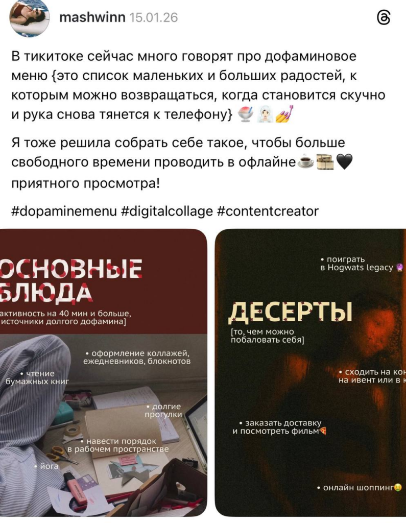Именно социальные сети превратили дофаминовое меню в популярный тренд. В TikTok, Threads пользователи не только рассказывают о своих списках радостей, но и визуализируют их — в виде цифровых коллажей, эстетичных карточек, заметок или серий сторис.