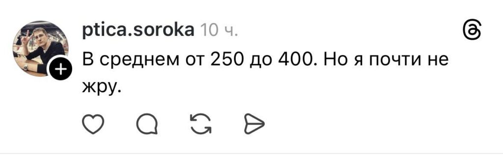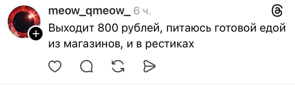Дискуссия в Threads в очередной раз показала, что понятие «нормальных» расходов на еду — вещь сугубо субъективная. Для одних 900 рублей в месяц на еду — результат строгого планирования своего бюджета, для других — цена комфорта, которая может быть увеличена в разы. В итоге, каждый сам выбирает баланс между экономией и качеством жизни, исходя из своих приоритетов и возможностей.