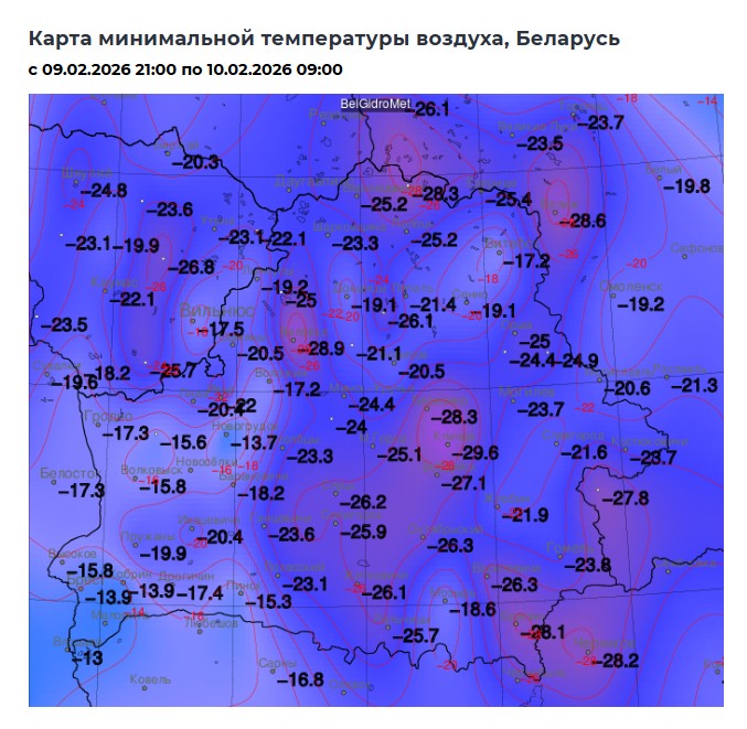В Минской области в двух городах этой ночью было очень морозно. Так, Вилейка отмечена на карте в минус 28,9°C, а в Березино температура опустилась до 28,3 градусов.