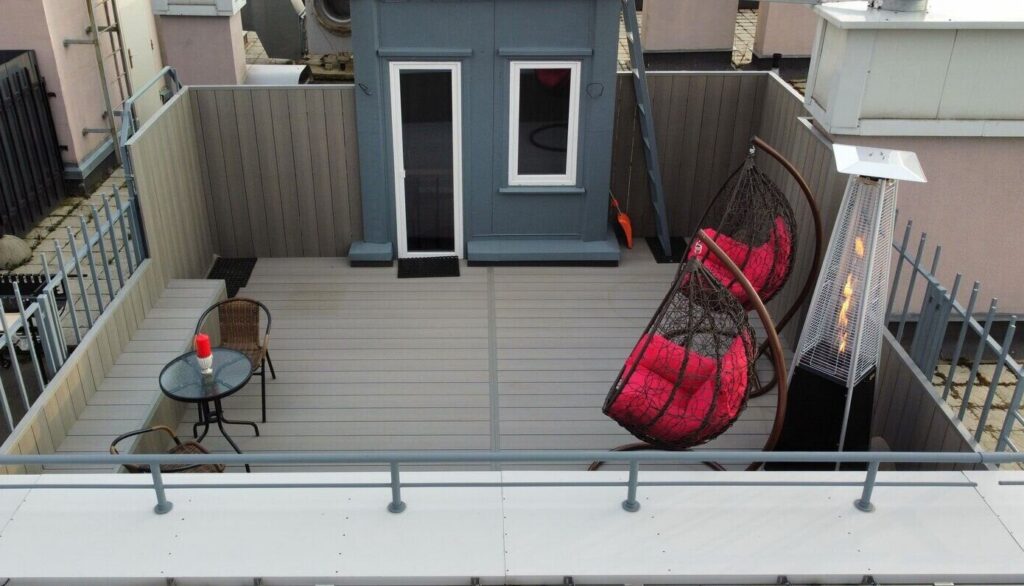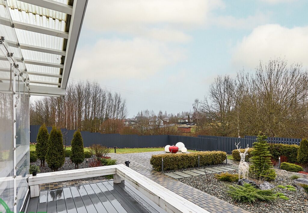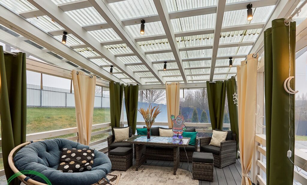 При входе в дом расположена небольшая застекленная веранда. К дому также пристроена терраса, куда проведено электричество, и установлена мягкая мебель. С террасы открывается великолепный вид на участок, который ухожен и облагорожен.