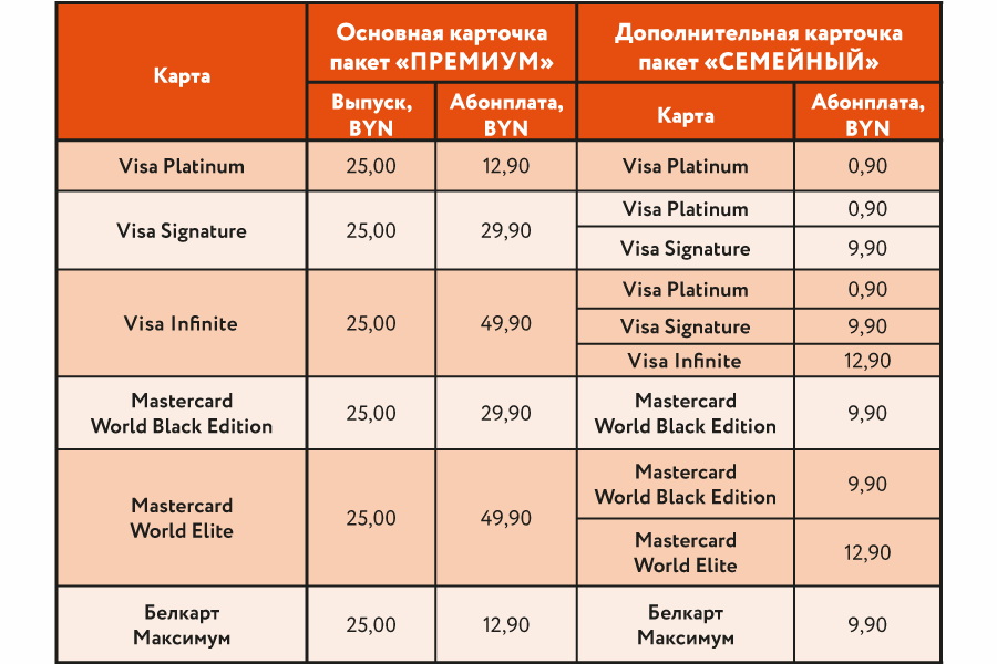 С мая в премиальной линейке банка – пополнение. Теперь в пакет «Премиум» будут входить не только привычные Visa Platinum, Visa Infinite, Mastercard World Black Edition и Белкарт Максимум, но и две новые карты: Visa Signature и Mastercard World Elite.