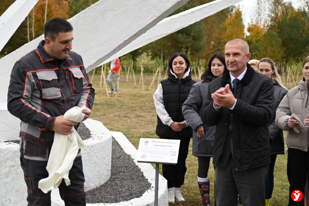 «Эти деревья растут для будущего, укрепляя наше единство. Пусть они хранят тепло наших рук и общность наших целей», — гласит надпись на табличке.