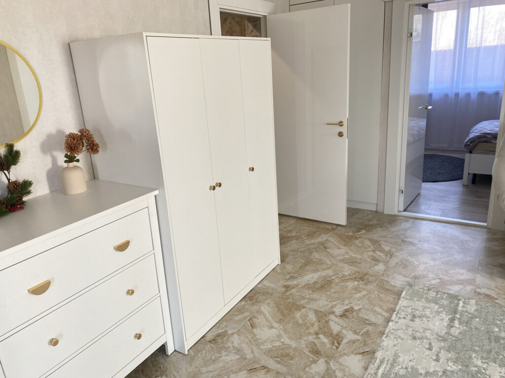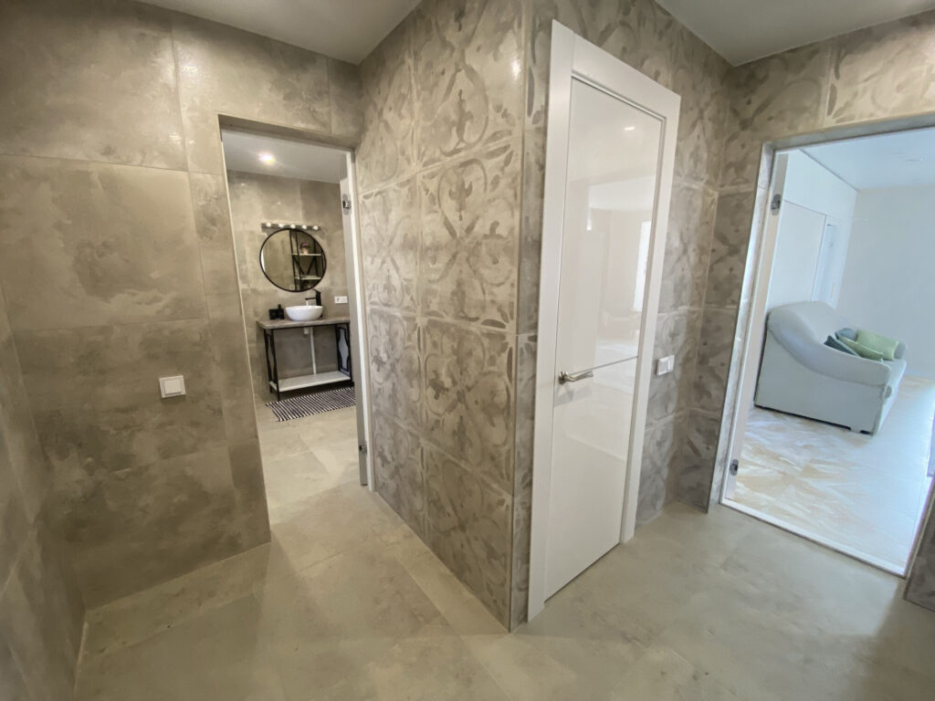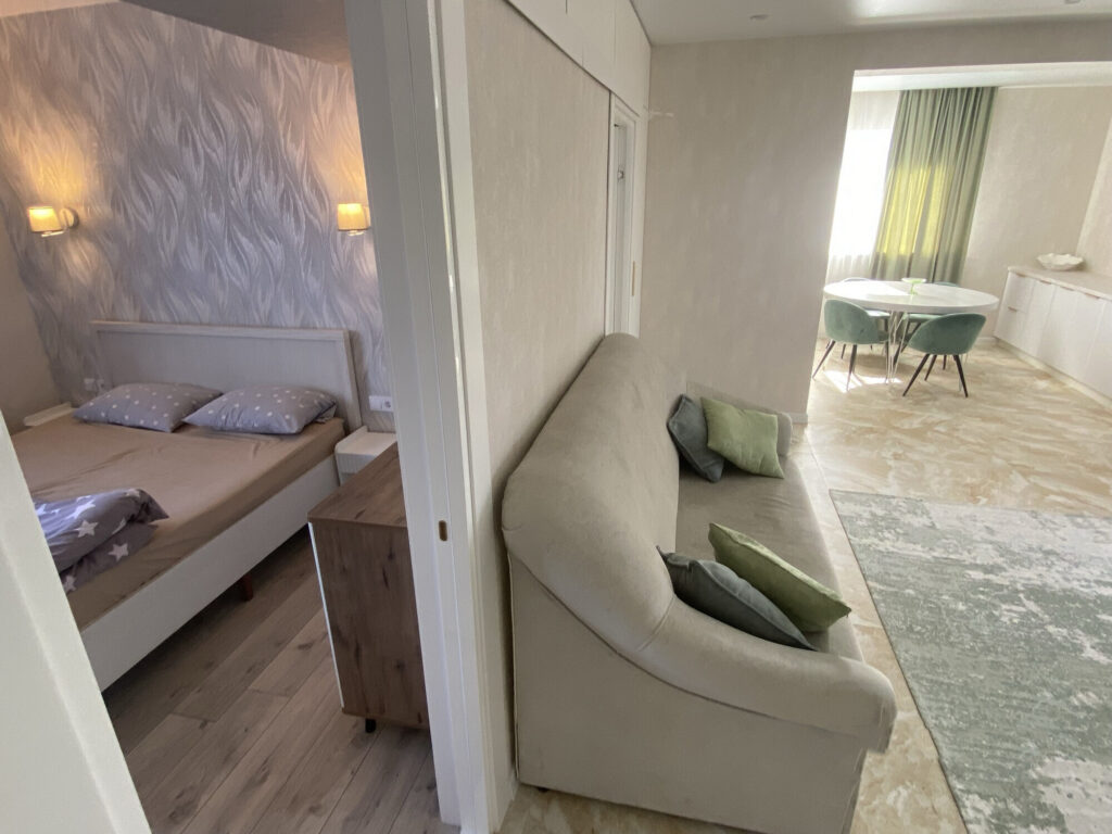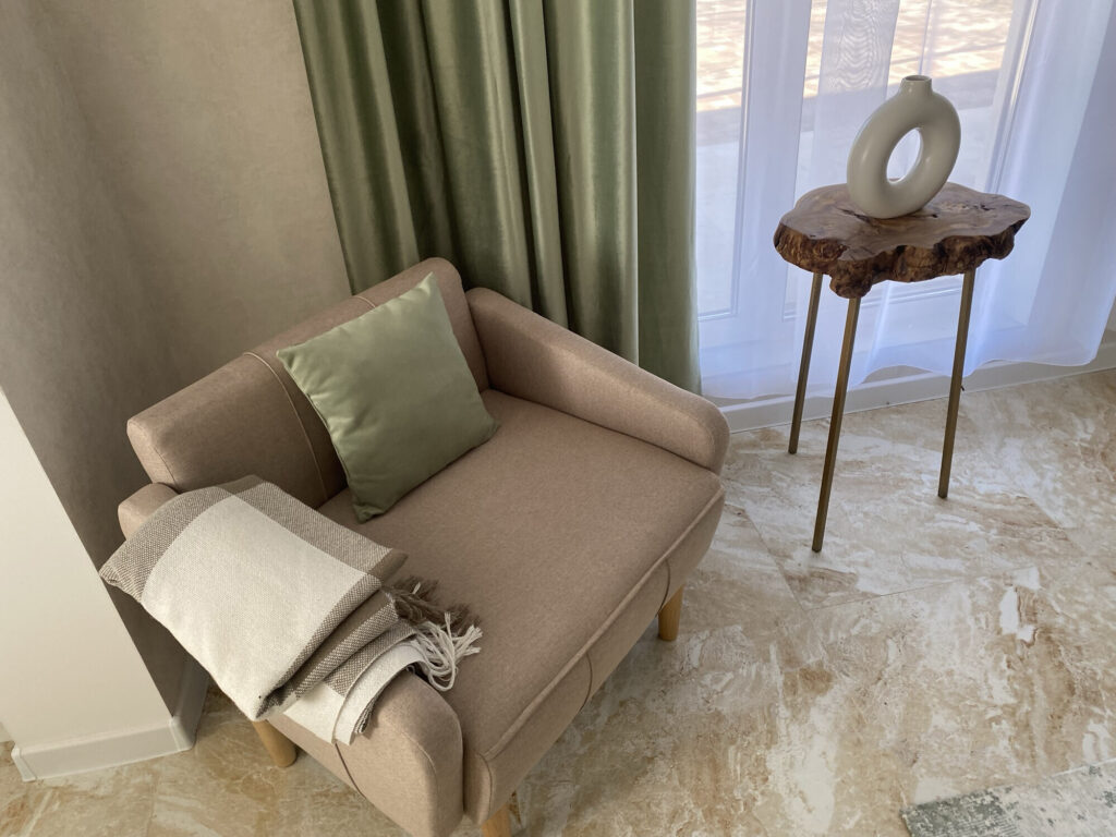 Интерьер дома полностью готов к заселению. Здесь выполнен качественный ремонт, который включает в себя установку современных стеклопакетов в окнах. На полах уложен ламинат и плитка. Стены оформлены в светлых тонах.