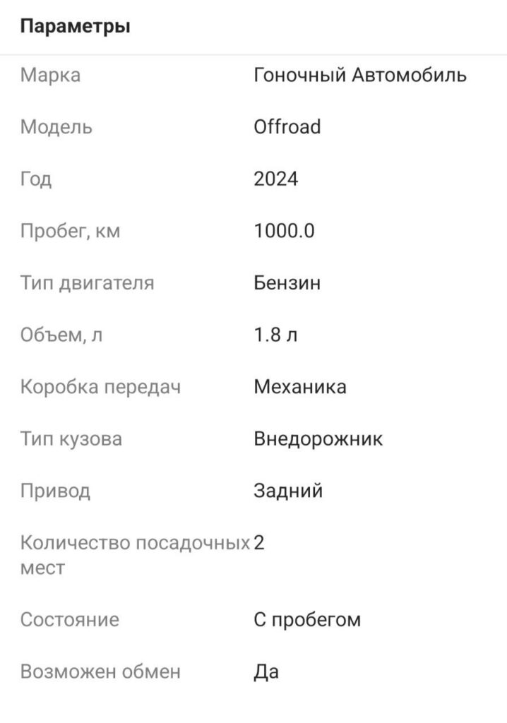 Стоит начать с того, что гоночный автомобиль находится в Мозыре и данное предложение было опубликовано аж 29 августа. Владелец заявляет, что это проект, который требует доработки. У мужчины нет времени им заниматься, а основа уже сделана. Судя по всему будущий Offroad был начат в 2024-м году и уже имеет пробег 1000.0 км. Бензиновый двигатель на 1.8 литра, а также механическая коробка передач дополняют товар. Привод — задний, а посадочных места всего два. Также обладатель незаконченной разработки допускает обмен. На каком этапе гоночный автомобиль? Уже имеются мотор и задняя подвеска от Opel Kadett. Рычаги — самодельные, перед от Fiat Tipo. Нужно сделать кулису, провести тормозные трубки, доделать проводку и можно отправляться участвовать в гонках.