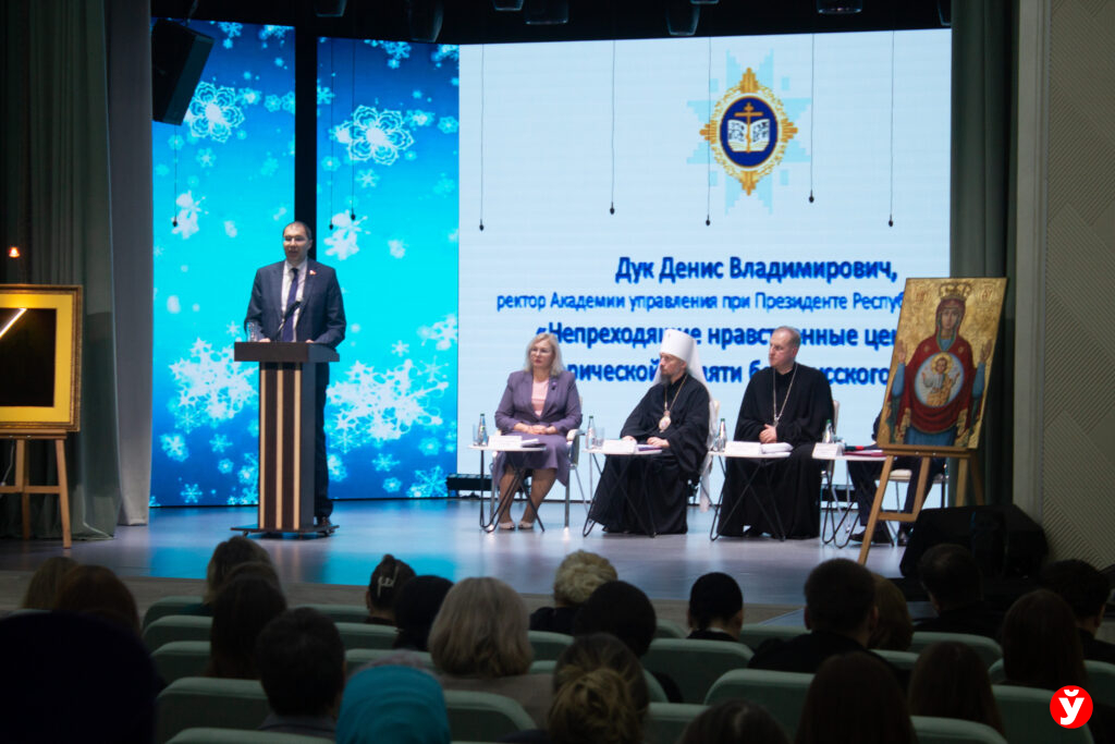 После приветственных слов почетных гостей на сцену вышли спикеры. Ректор Академии управления при Президенте Республики Беларусь Денис Дук выступил с докладом о непреходящих нравственных ценностях в исторической памяти белорусского народа. Он отметил высокую образовательную и книжную традицию наших предков, затронул тему униатства, вспомнил про роль церкви во время Великой Отечественной войны. Спикер сделал акцент на том, что сегодня духовенство и власть работают вместе над национальной политикой государства, задача которой сохранять традиционные ценности.