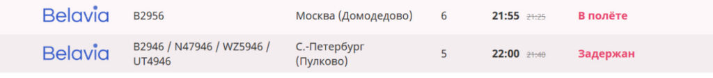 - Рейс «Белавиа» Москва — Минск вместо 21:25 прибудет в 21:55.