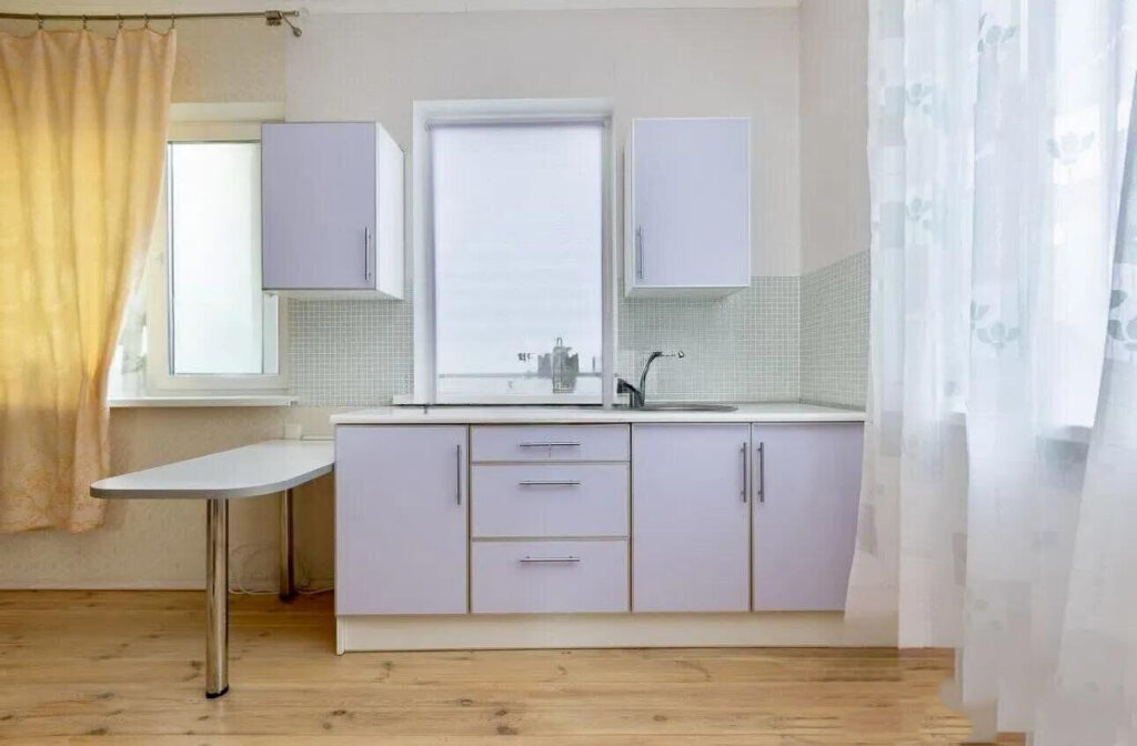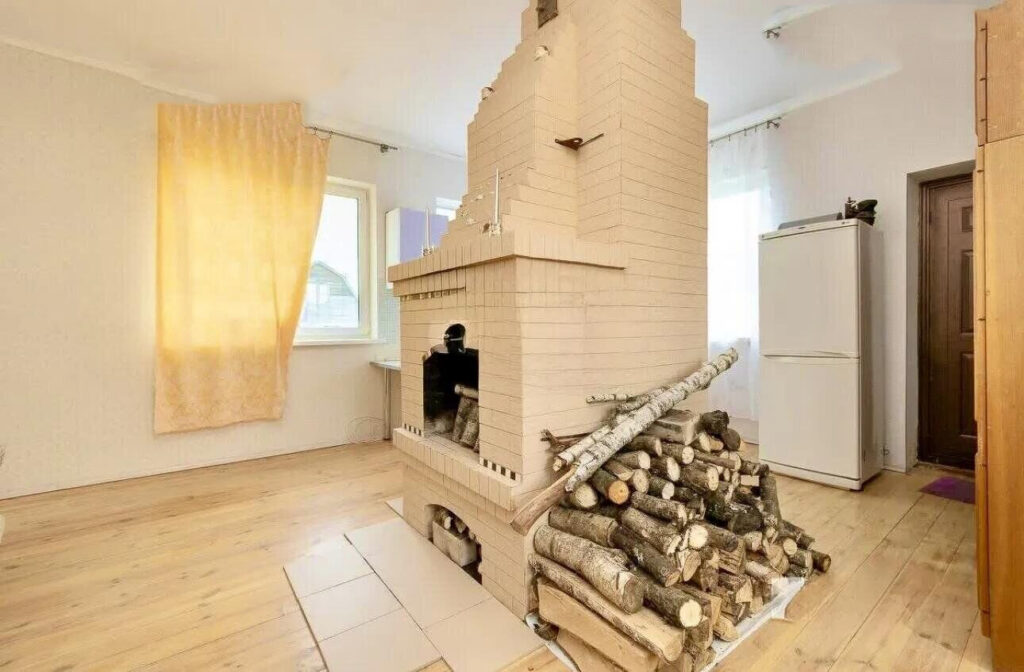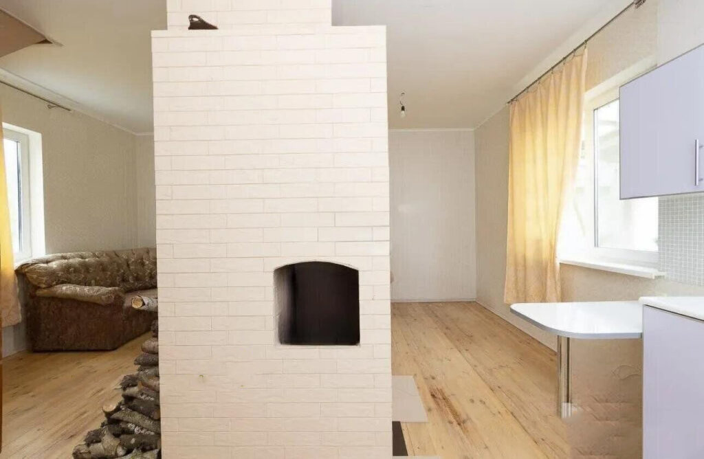Внутреннее оформление дома выполнено в светлых тонах. На первом этаже находится общее пространство, в центре которого расположена печка. Здесь же организованы несколько функциональных зон, включая кухонную область, где установлена газовая плита, работающая от 5-литрового баллона. Вода в доме также является сезонной, и для удобства имеется бойлер на 20 литров.