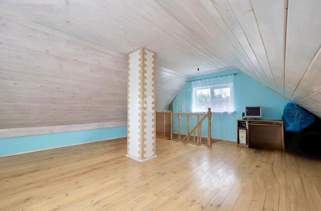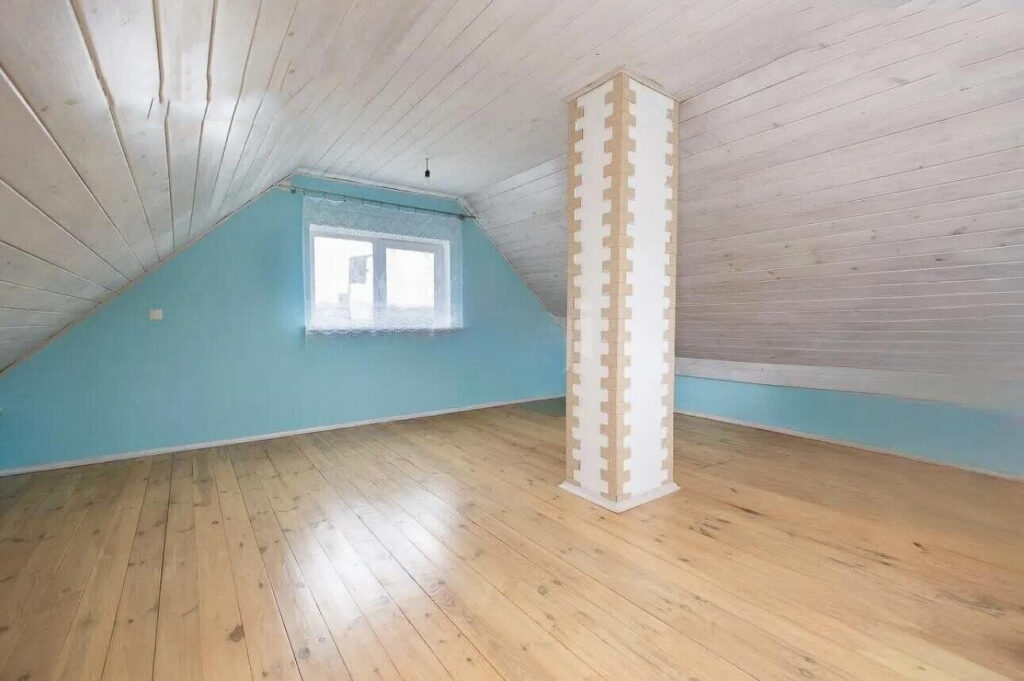 Второй этаж представляет собой мансардное пространство, где стены и потолок отделаны деревом, что придает помещению особый шарм и уют. Хотя в самом доме нет душа и санузла, они предусмотрены в отдельной постройке, где также имеется бойлер на 80 литров.