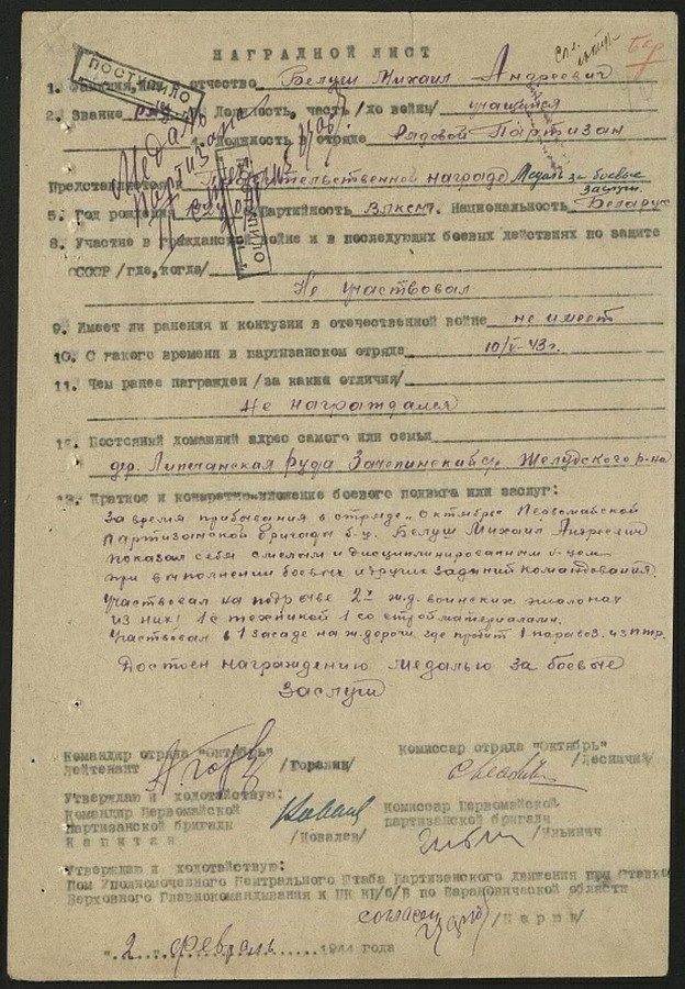 На сайте Издательского дома «Беларусь сегодня» и Национального архива Беларуси «Партизаны Беларуси» есть имя партизана-героя Михаила Андреевича Белуша и наградной лист на него. Вот текст этого документа, подписанного командиром партизанского отряда «Октябрь» Гореликом и комиссаром отряда Лесничим:
