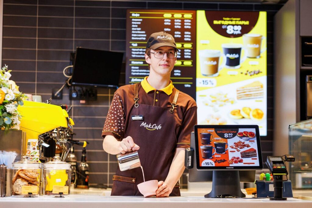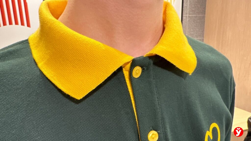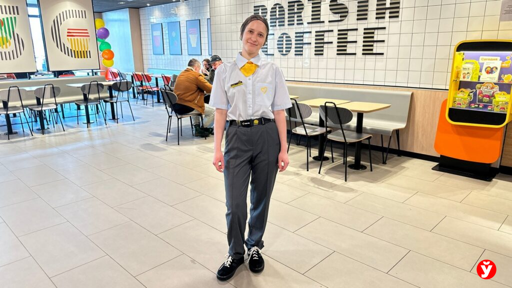Внимательный посетитель заметит любопытную деталь: по воротничку можно определить возраст сотрудника. Несовершеннолетние ребята носят обычные футболки, а их старшие коллеги — поло с воротником. Менеджеры и вовсе выделяются «небесными» оттенками.