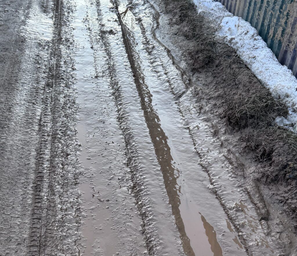 «Это не дорога, а сплошная полоса грязи. В период таяния снега участок превращается в вязкую массу, по которой невозможно пройти. Дети каждый день пробираются по этой «каше» в школу, взрослые — на работу. Люди скользят, пачкают одежду и рискуют упасть», — описывает ситуацию автор фото.