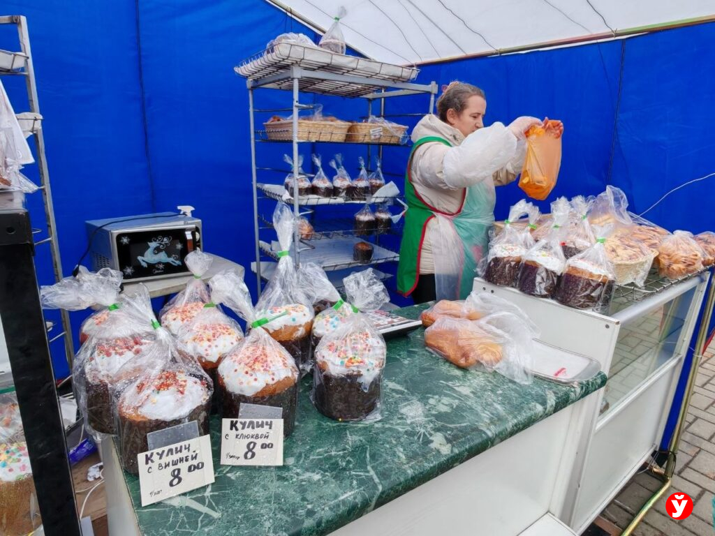Пасхальную выпечку привезли порядка трех производителей. Куличи, кексы, пряники, пирожные — с творогом, изюмом, цукатами, шоколадом, маком, курагой, корицей, вишней, клюквой. Самые маленькие, весом всего 250 грамм, стоят 6-7,5 рублей. Которые поувесистее: уже 11-25 рублей. Минчане охотно покупают и те, и другие.